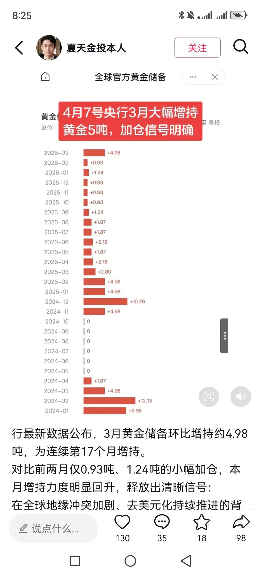 昨日央妈又搞大动作,3月末增持黄金4.98吨,夜里原油大跌时黄金直线拉升,这操作稳赚啊!从2024年11月开始,央妈已连续17个月增持黄金,3月增持速度还加快了。