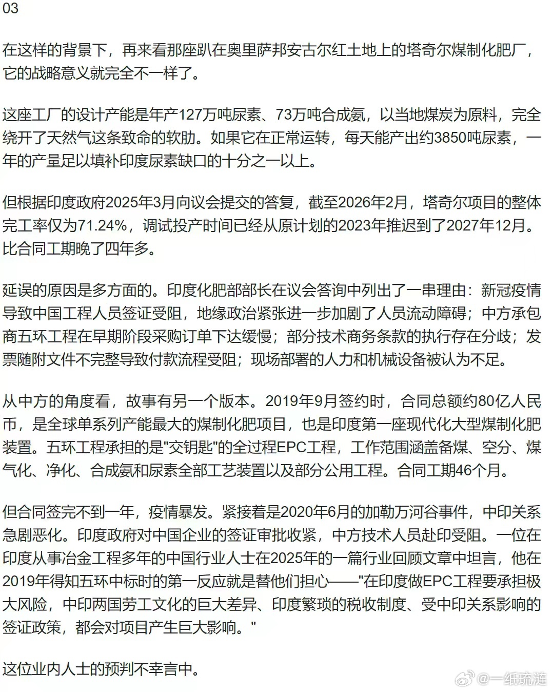 世界上最大的煤炭制尿素项目(世界上大部分尿素是天然气为原料),由中国企业替印度设计并制造,而且是采用的是风险极高的EPC工程模式。中国五环当初高调当做重大成就来鼓吹,如今项目处于尴尬状态。明明是我们在主动资敌,正好遇上脑回路清奇的印度人自己也拼命拦着不让我们主动资敌。国内业界人士当初对此有没有担心?确实是有的。如今现实摆在那里,如果只靠印度自己很难把工业体系运行起来,各种请托、贿赂、回扣、拖延,本身阿三又是极度效率低下,毫无诚信,极度腐败,毫无时间概念,撒谎成性的民族性。这样的种族怎么搞的好工业化。但是架不住有其他国家的雷锋要去帮忙啊!帮忙帮到最后说不定还成了义务劳动。
