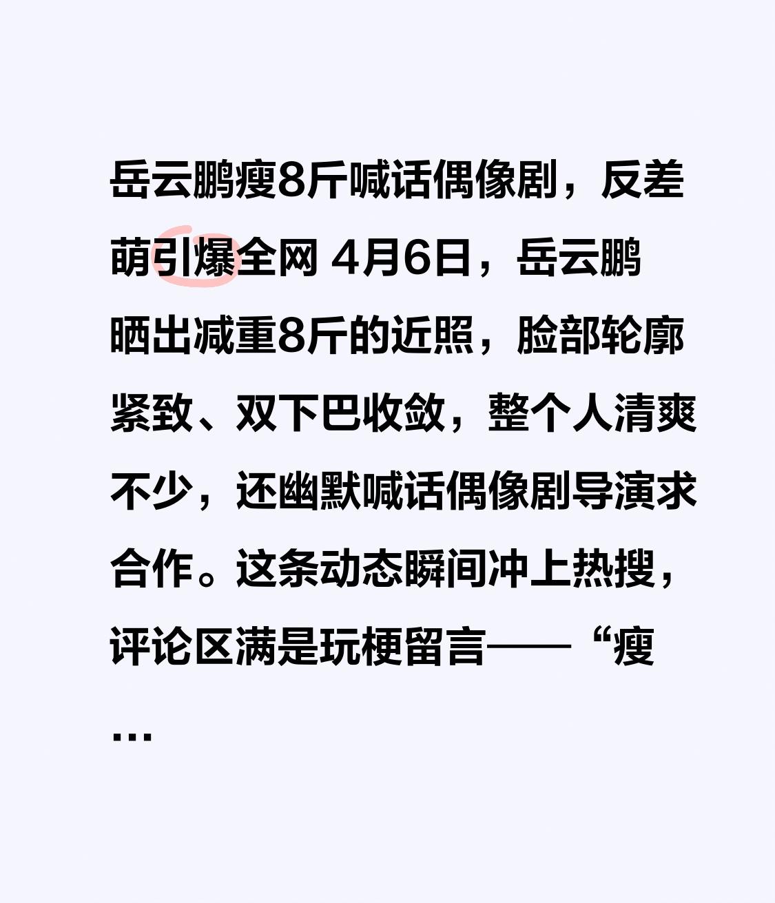 岳云鹏瘦8斤喊话偶像剧,反差萌引爆全网 4月6日,岳云鹏晒出减重8斤的近照,