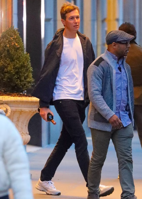 这次外出似乎是与老朋友们的一次小型聚会,库什纳当晚带着一瓶葡萄酒,这巧妙地暗示了当晚的私密晚宴氛围。