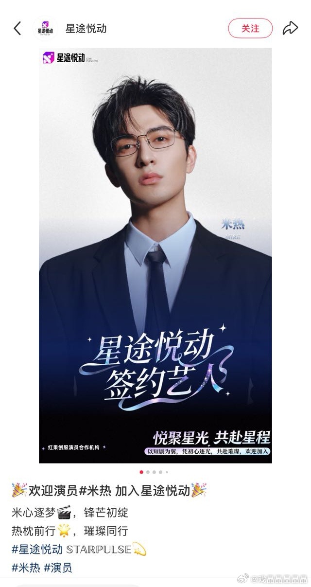 米热正式加入星途悦动了,容量短剧旗下厂牌。米热以前是于歪欢娱的艺人。