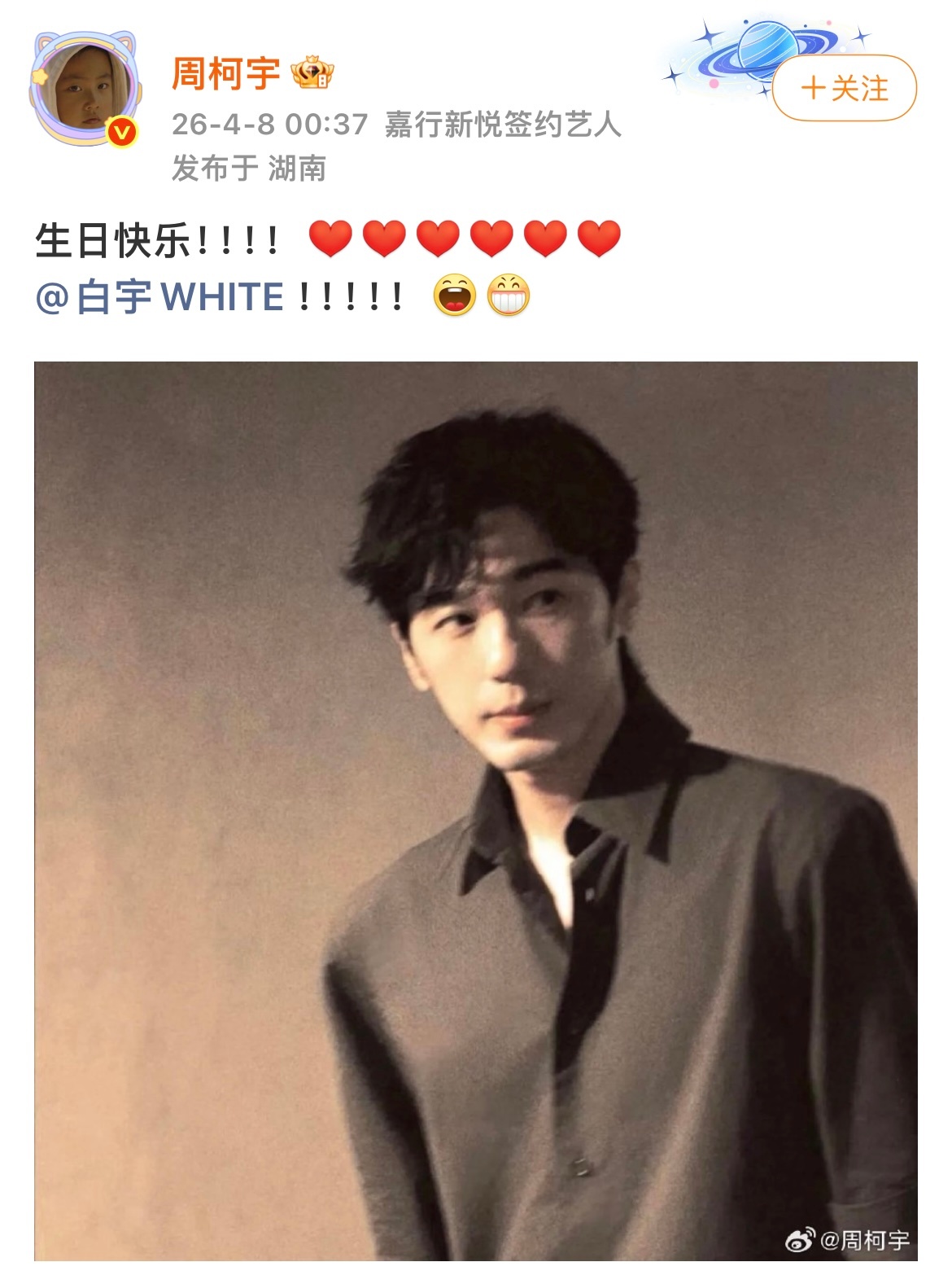 啊哈哈哈哈哈哈哈周柯宇你别太爱了!给白宇发生日快乐是得发六个爱心,还不忘在评论区夸个帅哥的程度