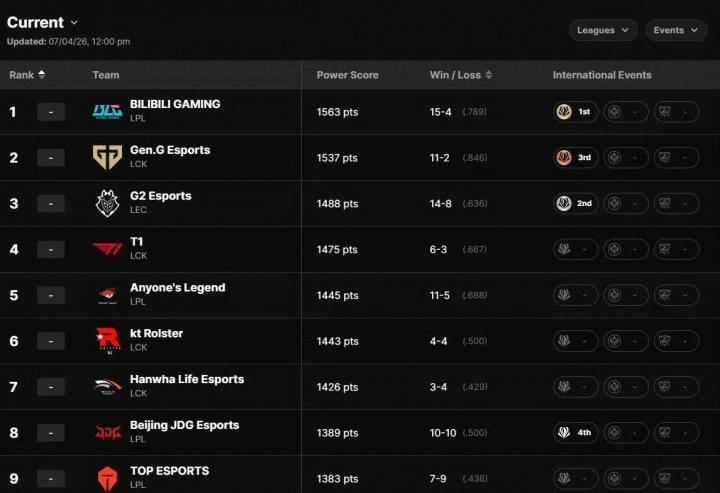 世界第一战队了解一下!今日LOL全球战力排行榜更新:夺得先锋赛冠军的BLG目前在
