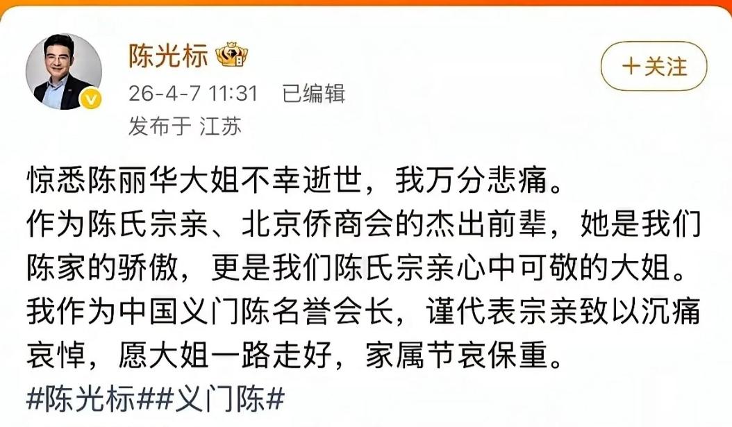 唐僧老婆死了,闹出天大的笑话。 4月5日,著名女富豪陈丽华离世,她老公就是西游记唐僧的扮演者迟重瑞,所有有网友说看来吃唐僧肉也不能长生不老啊。 就没有陈光标不蹭的流量,谁火他蹭谁,蹭完活人张雪,蹭死人陈丽华。陈丽华女士刚刚离世,陈光标第一时间就跳出来发声,直言都姓陈,算是陈氏宗亲,她是我们陈家的骄傲,更是我们陈氏宗亲心中可敬的大姐。 可谁料,陈光标“哭错坟”了。人家陈丽华是满族正黄旗,叶赫那拉氏第八代知悉后裔,跟慈禧是同族。当年辛亥革命后,不少满族人为求自保纷纷改了汉姓,陈丽华并非汉姓。 就跟马斯克一样,人家可不姓马。陈光标只看姓氏就认亲,跟着哭丧掉泪,说白了就是蹭流量蹭热度,属实是哭错坟了,尴尬得要死。