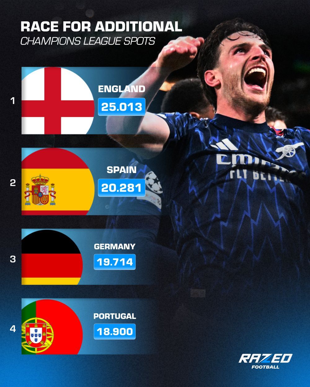 哈弗茨绝杀里斯本竞技,可能帮助了利物浦……目前英超已经锁定了下赛季第5个欧冠名额,而目前利物浦排名英超第5位。如果极端的情况发生,英超也许有6支甚至是7支球队能够参加欧冠。英超:25.013西甲:20.281德甲:19.714葡超:18.900意甲:18.714法甲:16.392现在悬念反而是夏季还是德甲,能成为下一个拥有5个欧冠席位的联赛。不过通过欧战积分,大家是不是可以重新审视五大联赛了葡萄牙体育0比1阿森纳哈弗茨绝杀