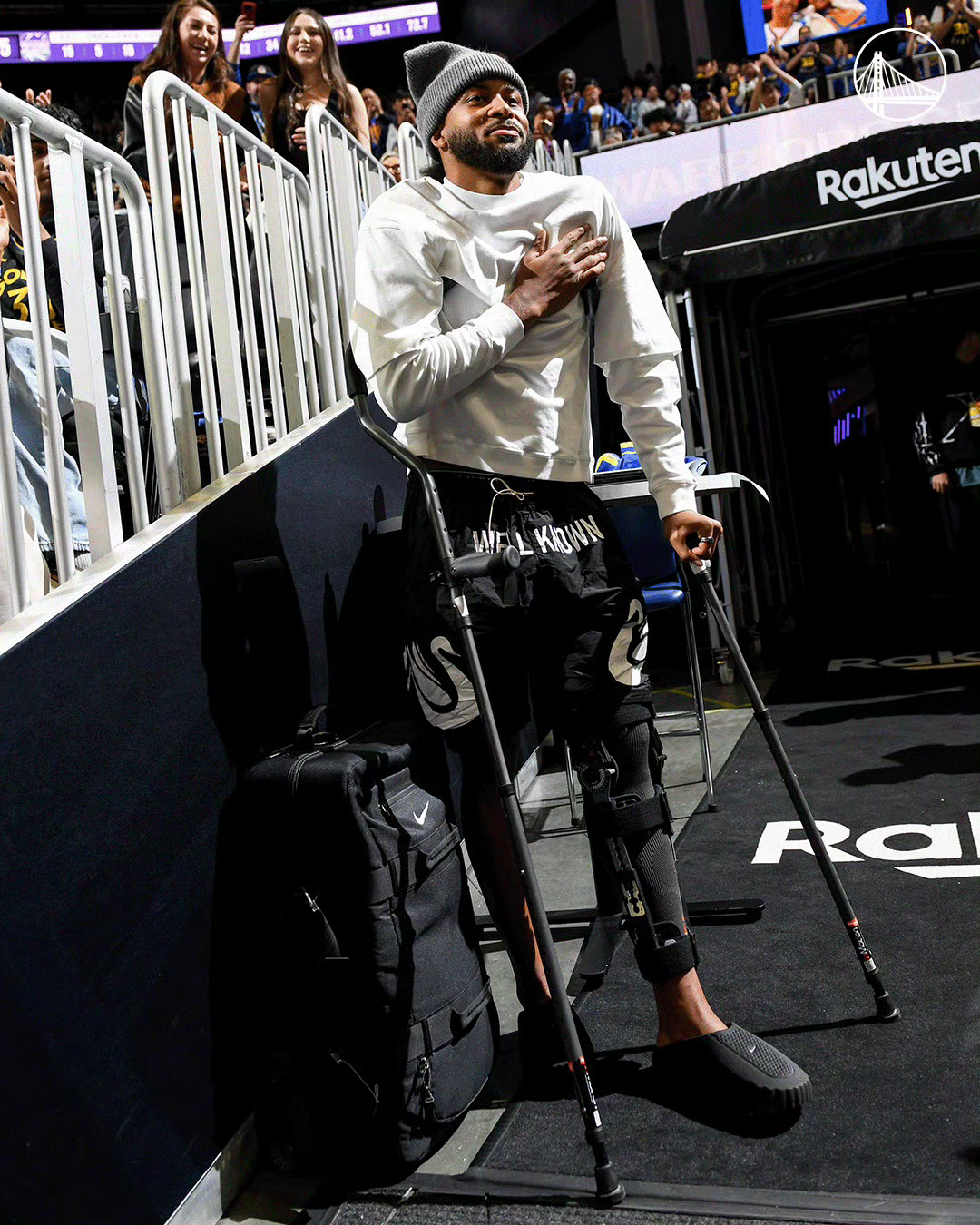 最好的穆迪!….刚刚做完手术,穆迪这就拄着拐来现场了,还跟波斯特唠嗑呢金州勇士