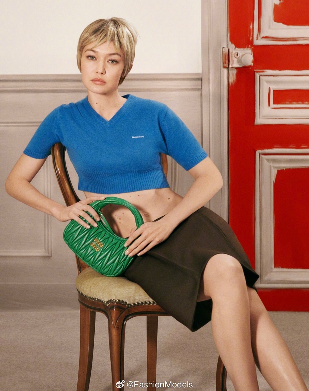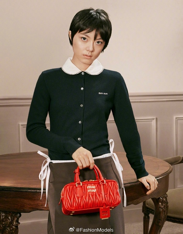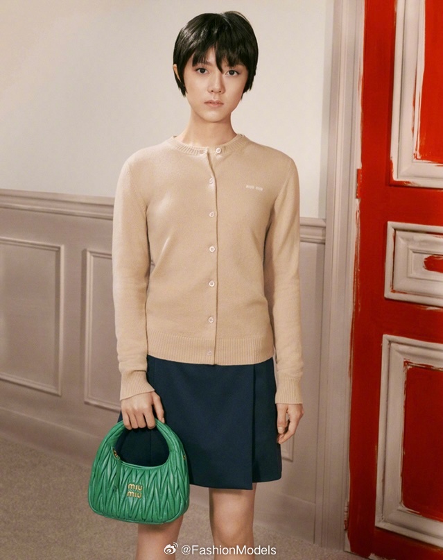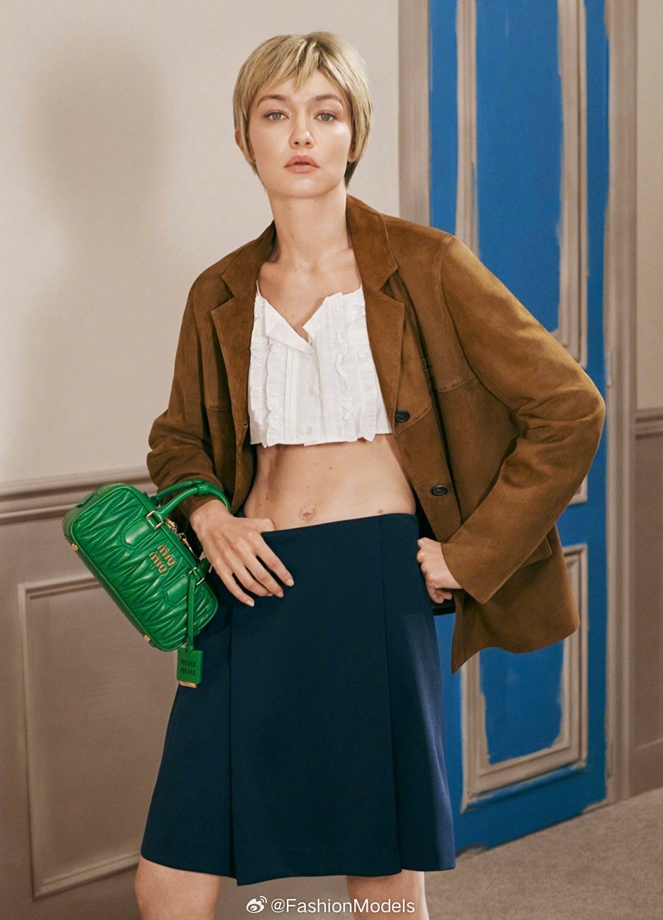 赵今麦以短发造型,携手Gigi Hadid共同演绎MIU MIU全新手袋广告。