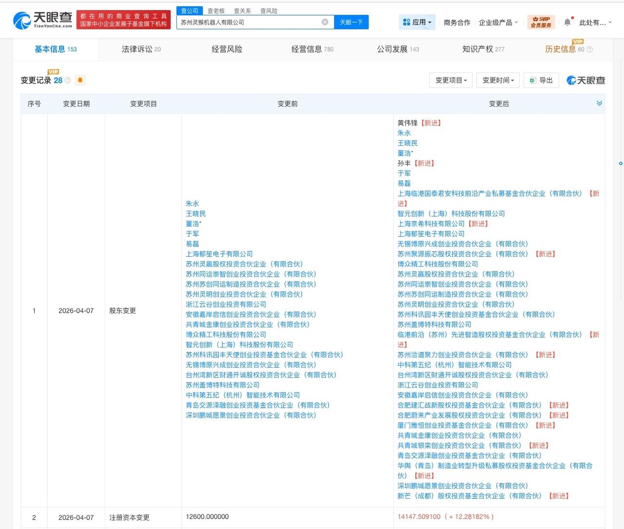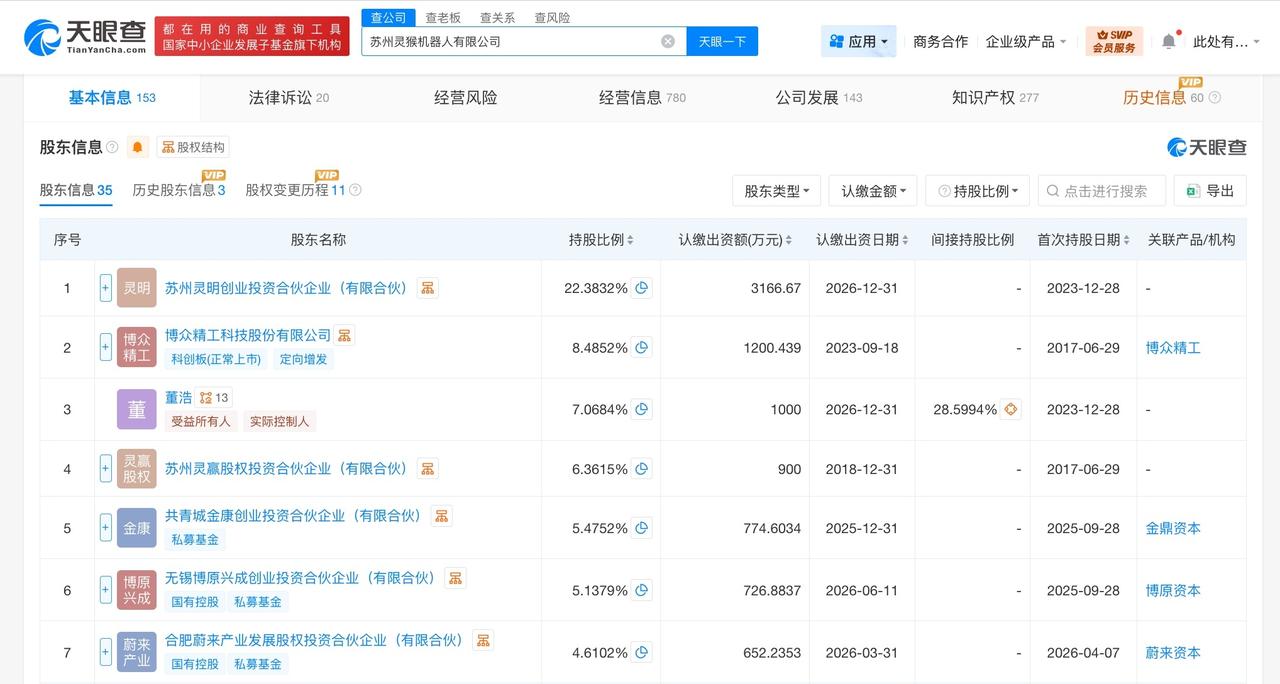 蔚来资本等入股灵猴机器人 天眼查App显示,近日,苏州灵猴机器人有限公司发生工商变更,新增蔚来资本旗下合肥蔚来产业发展股权投资合伙企业(有限合伙)、上海临港国泰君安科技前沿产业私募基金合伙企业(有限合伙)、厦门雅恒创业投资基金合伙企业(有限合伙)等为股东,同时,注册资本由1.26亿人民币增至约1.41亿人民币。 苏州灵猴机器人有限公司成立于2015年4月,法定代表人为董浩,经营范围包括工业机械手、机器人的研发、生产和销售,工业相机、机器视觉系统的研发、生产和销售,智能机器人的研发等,由董浩、博众精工(688097)及上述新增股东等共同持股。 公开信息显示,苏州灵猴机器人有限公司是一家集研发、生产、销售及服务于一体的专注智能制造和具身智能领域的核心零部件供应商。 天眼查信息: