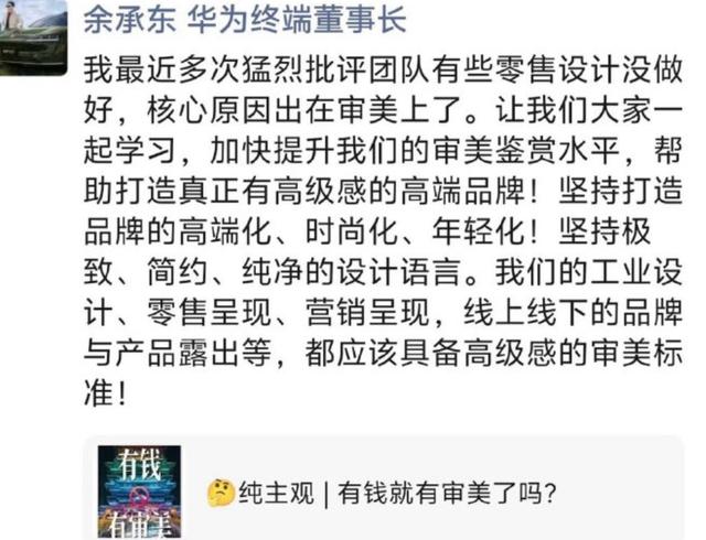 4月8日一大早,电车通(ID:dianchetong233)发现余承东在朋友圈毫不客气地批评自己的设计团队:“零售设计没做好,需要加快提升审美鉴赏水平。”