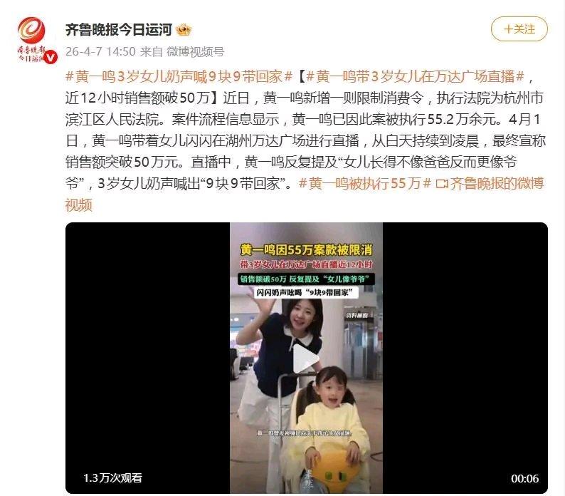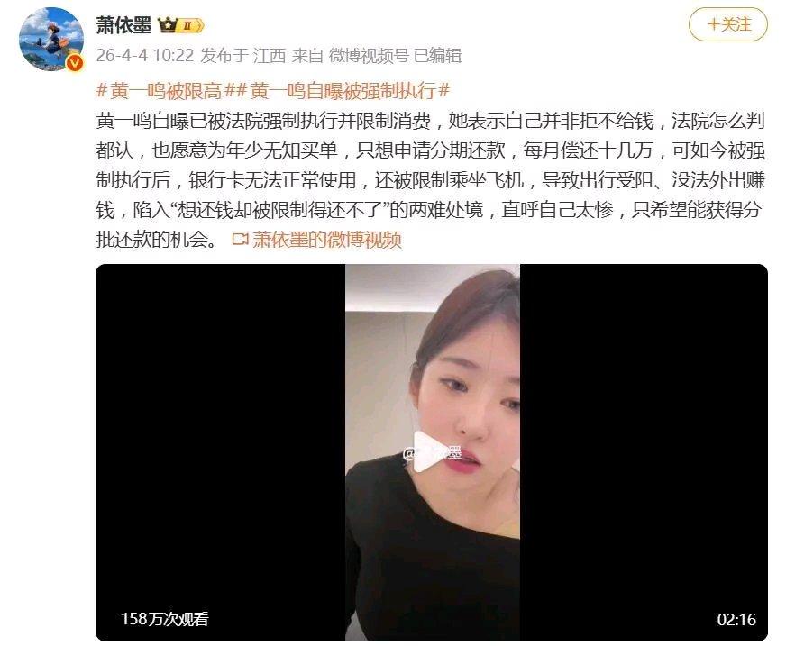 黄一鸣这事儿太抓马了!她本是《青春有你2》选手,转型直播带货有140.9万粉丝,1分钟视频报价11.5万。4月4日在万达直播还创下50万带货业绩,谁能想到三天后就新增限消令,已被执行55.2万。