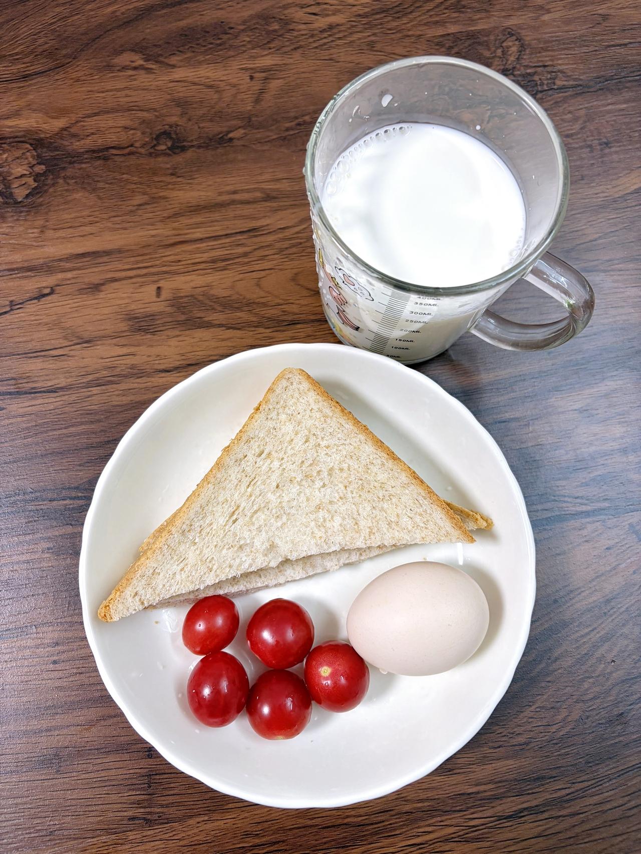 今日减脂早餐:全麦面包+鸡蛋+番茄+纯牛奶