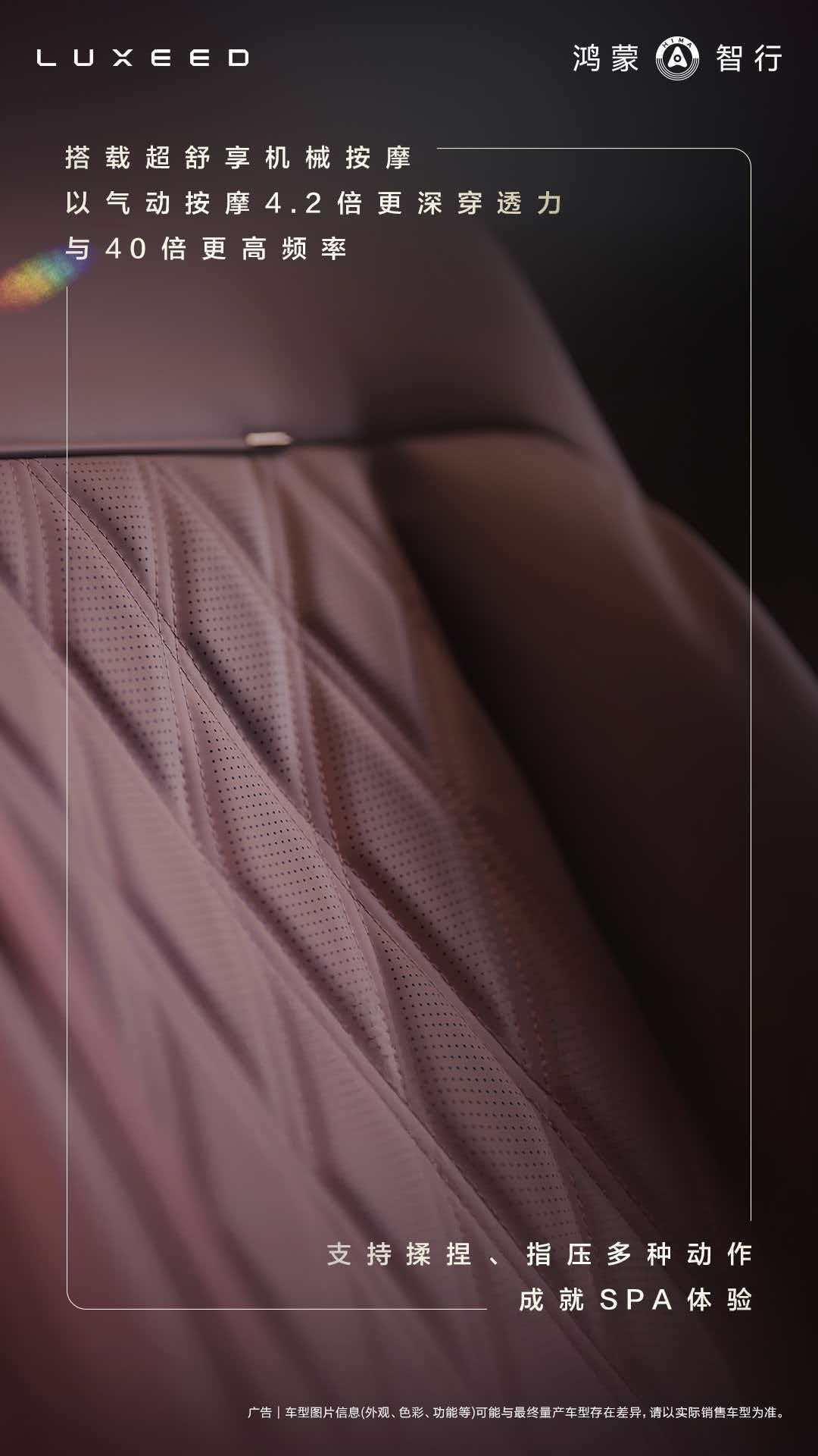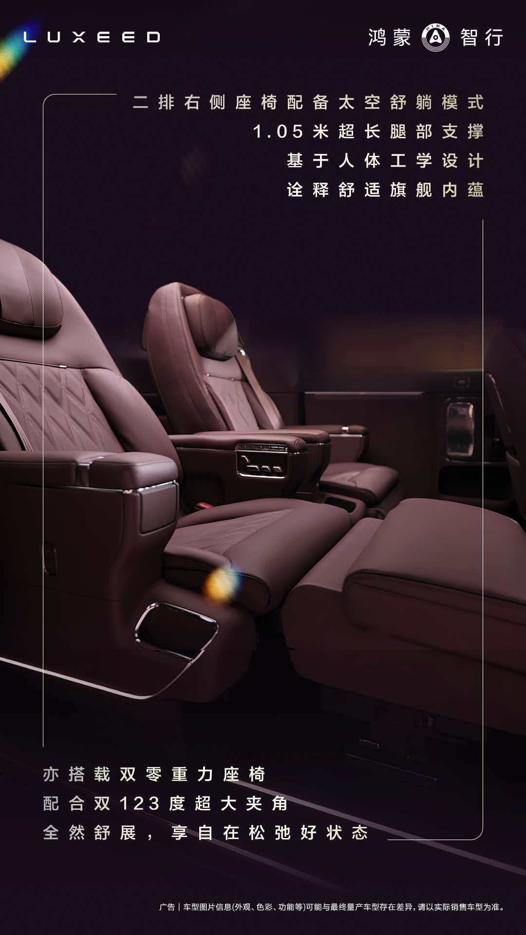 - 激光雷达+HarmonyOS智能座舱- 三排空间:二排腿部1008mm/三排腿部990mm- 全粒面Nappa头层真皮+半苯胺皮革- 座椅15层靠背+12层坐垫,60Kg/m³填充棉- 双零重力座椅+1.05米超长腿托+123度夹角- 机械按摩,穿透力是普通气动的4.2倍