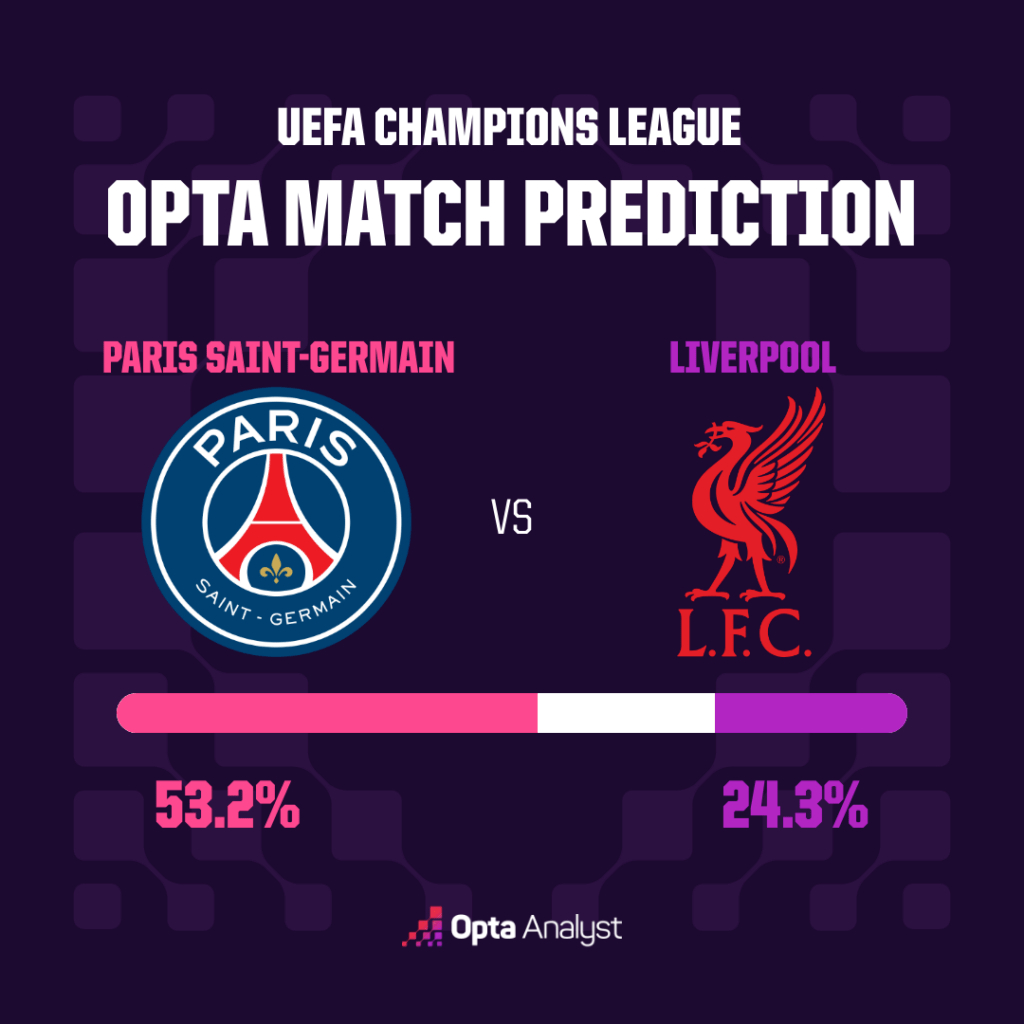 上赛季1/8决赛赛前,Opta超级计算机预测利物浦晋级概率为58.3%,是更被看好的一方。而本赛季,在一万次模拟推演中,巴黎晋级概率达59.6%,占据上风。