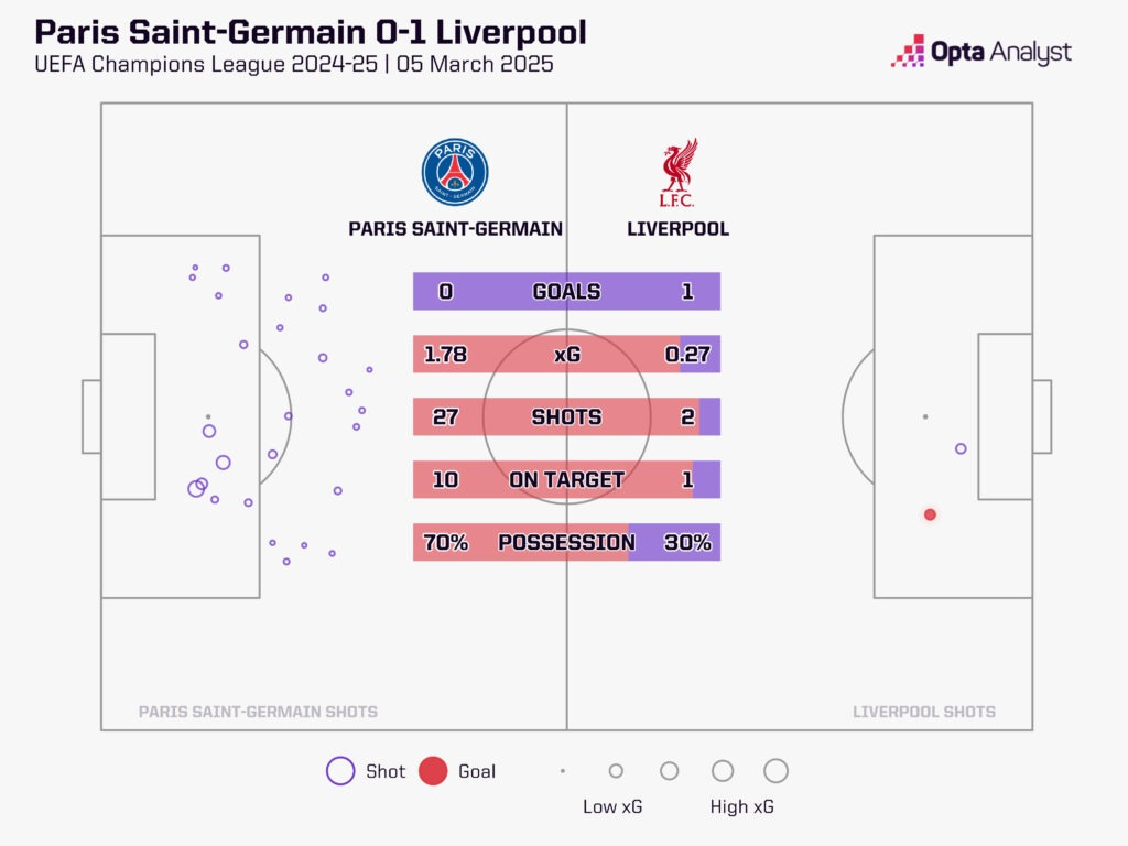 2025年3月5日,阿利松做出惊人的9次扑救——这一数据追平了欧冠淘汰赛门将单场扑救次数纪录。利物浦仅凭借替补登场的埃利奥特的绝杀取胜,全场射门数仅2次,比对手少25次。这是2003-04赛季有统计以来,欧冠淘汰赛取胜球队中射门数劣势最大的场次之一,与2021年4月巴黎对阵拜仁一役持平。
