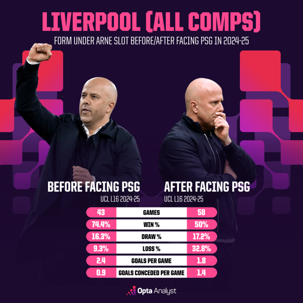 而在被最终的欧冠冠军巴黎淘汰后,球队各项赛事出战58场,取胜29场(胜率50%),平局10场(17.2%),失利19场(32.8%)。斯洛特治下的利物浦,从上赛季对阵巴黎前输球率不足10%,跌至此后近三分之一的比赛都以失利告终。