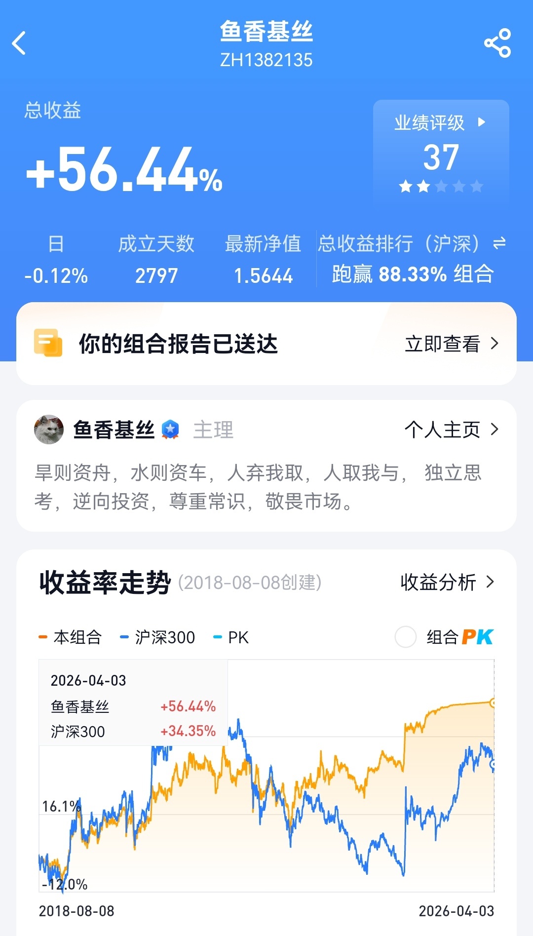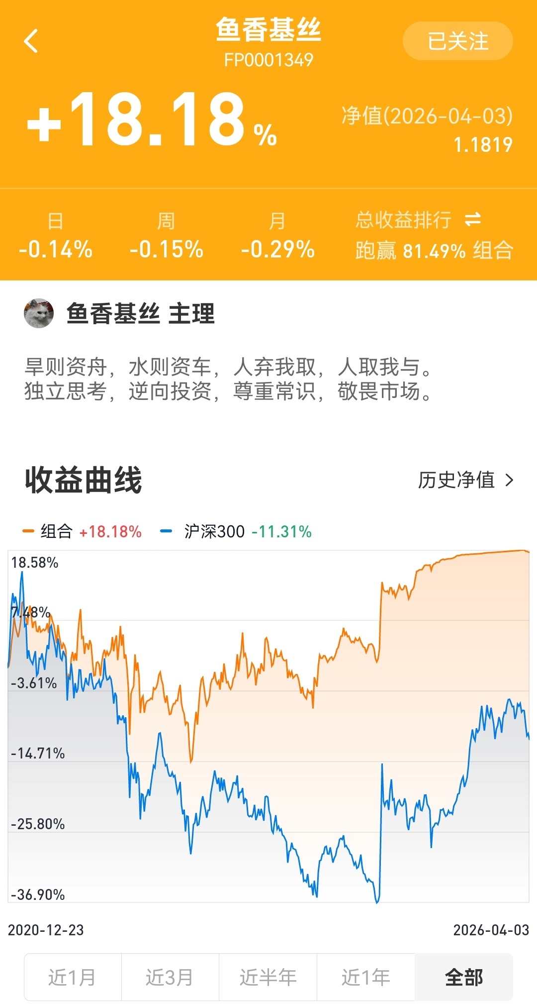 2026年4月3日鱼香基丝指数基金投资组合实盘周报 成立以来场外组合收益率18.1%,场内组合56.4%,跑赢同期沪深300指数29个百分点。本周继续加仓极低估蓝筹指数,组合总仓位20%,仓位具体占比为:港股通互联网指7%,港股通消费指数4%,中证消费指数4%,中证医疗指数4%、300非银指数1%。本周大盘继续下跌,组合跑赢大盘的百分比继续增加一个百分点。组合加入一个新的指数300非银指数,成分股主要为证券公司和少数保险公司,经过前期暴跌,现在估值极低,pe百分位到达历史极低位置,所以逢跌买入了一点。最近泡泡玛特股价暴跌,是港股通消费指数的重仓股,所以我们也乘机加仓,清明节去各大商场看,泡泡玛特门店的巨大客流量明细高于旁边商家,还是一个好生意,正好以便宜的价格买入优秀的企业。最近股市大跌,很多追涨的人都被套了,开始赖某某队大资金割韭菜,每次听到这种说法都觉得很可笑,你都知道割韭菜了,为啥你还要去当韮菜呢?还不是因为你贪婪呗,看见人家赚钱你也想赚钱,4000点以上的高位横盘这么长时间你还不跑,反倒加仓,不收割收割谁呢?投资赚钱了赖自己,赔钱了赖市场,赖某某队,赖量化,赖打仗,就是不赖自己投资水平差,这不就是标准的巨婴思维吗?我们决不当巨婴,尊重常识,敬畏市场。现在沪深300指数估值依旧偏高,未来下跌是大概率事件,现在只能买一点点极低估的指数。看到巴菲特的伯克希尔持有现金创历史新高现金仓位高达44%的新闻,股神也觉得现在市场高估了,面对高估的市场,我们要做的很简单,耐心等待,现金为王。投资a股股票