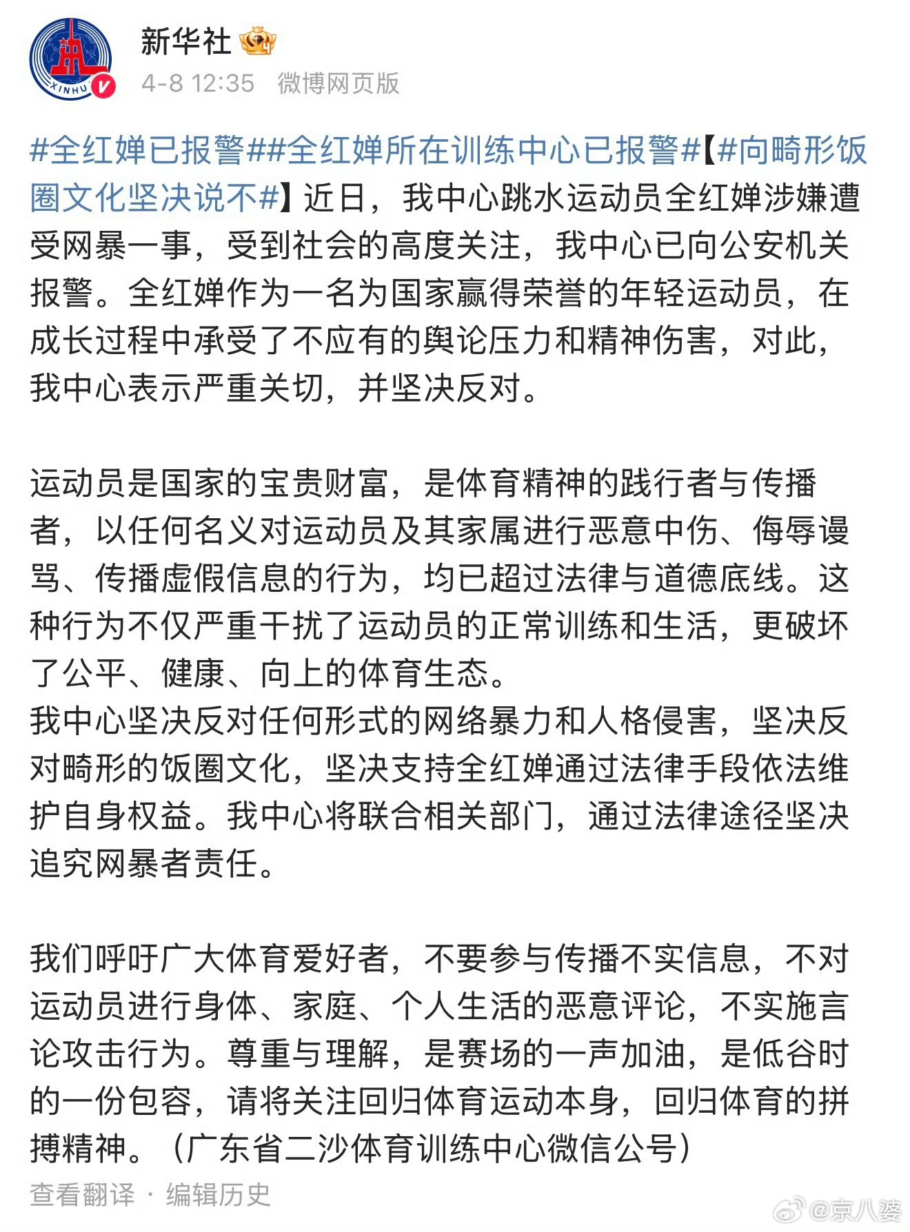 【#国家体育总局回应全红婵方报警#】#全红婵已报警#据国家体育总局游泳运动管