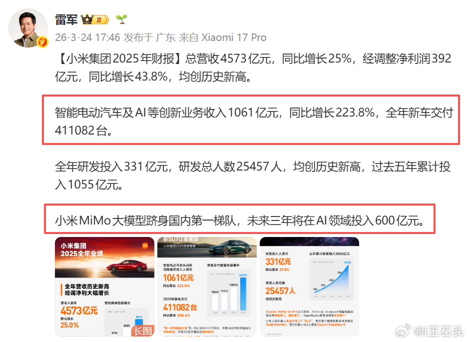 未来三年,小米将在AI领域投入600亿,核心叙事早就转向汽车和AI了,手机只是基本盘,全球前三的位置依然坚挺,这就行了!小米小米汽车