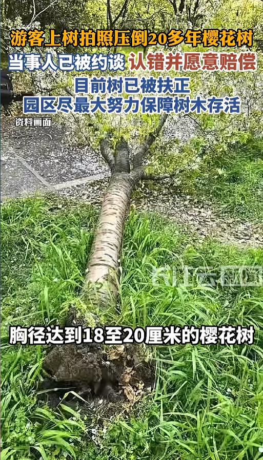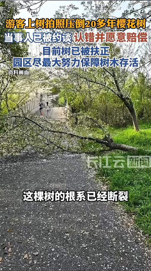 “鲁智深再世?”4月6日,上海,一女子为了拍照出片,竟然爬上了公园的一棵樱花树,可没想到刚爬上去,树就被压倒了。女子赶紧离开了现场,但很快就被园区找到了。园方说,这棵树已经20年树龄了!网友:出没出片不知道,反正是出事了! 外出游玩,一定得注意文明,爬树什么的可千万要不得。这不仅是为了树着想,更是为了人,谁也不知道是人先摔下来,还是树先倒下。 据媒体报道,该女子是外来务工人员,樱花树也在公园的免费区域,不远处也还有禁止攀爬的标志。女子是为了拍照好看,才想着爬上去。可没想到,树比人脆弱多了。 女子刚爬上去,树就倒了下来,比鲁智深倒拔垂杨柳还丝滑。女子倒是也没受什么伤,看见树倒了,吓得赶忙离开了现场。不过在当地公安、公园等多方寻找下,还是没有躲过去。事后女子也意识到了自己的错误,正在商讨赔偿事宜。 这是棵染井吉野樱,胸径已经长到18-20厘米了,自然培育的话得20年。虽然树已经被扶正了,但整棵树的根系已经断了,后期的养护难度很大,很难再养活了。 虽然这事儿明显是女子的错,但很多网友却在质疑这棵树。一棵20年的树,一碰就倒,是不是大风也能吹倒。甚至还有网友嘲讽,人碰倒了树要赔,树砸到人找谁赔呢? 归根结底还是爬树惹的祸,提醒大家在外面一定要文明游玩,别给自己,给别人找麻烦!也提醒大家理性吃瓜,不要带节奏! 信息来源:《游客上树拍照压倒20多年樱花树,目前树已被扶正,当事人已被约谈:承认错误并愿意赔偿》长江云新闻