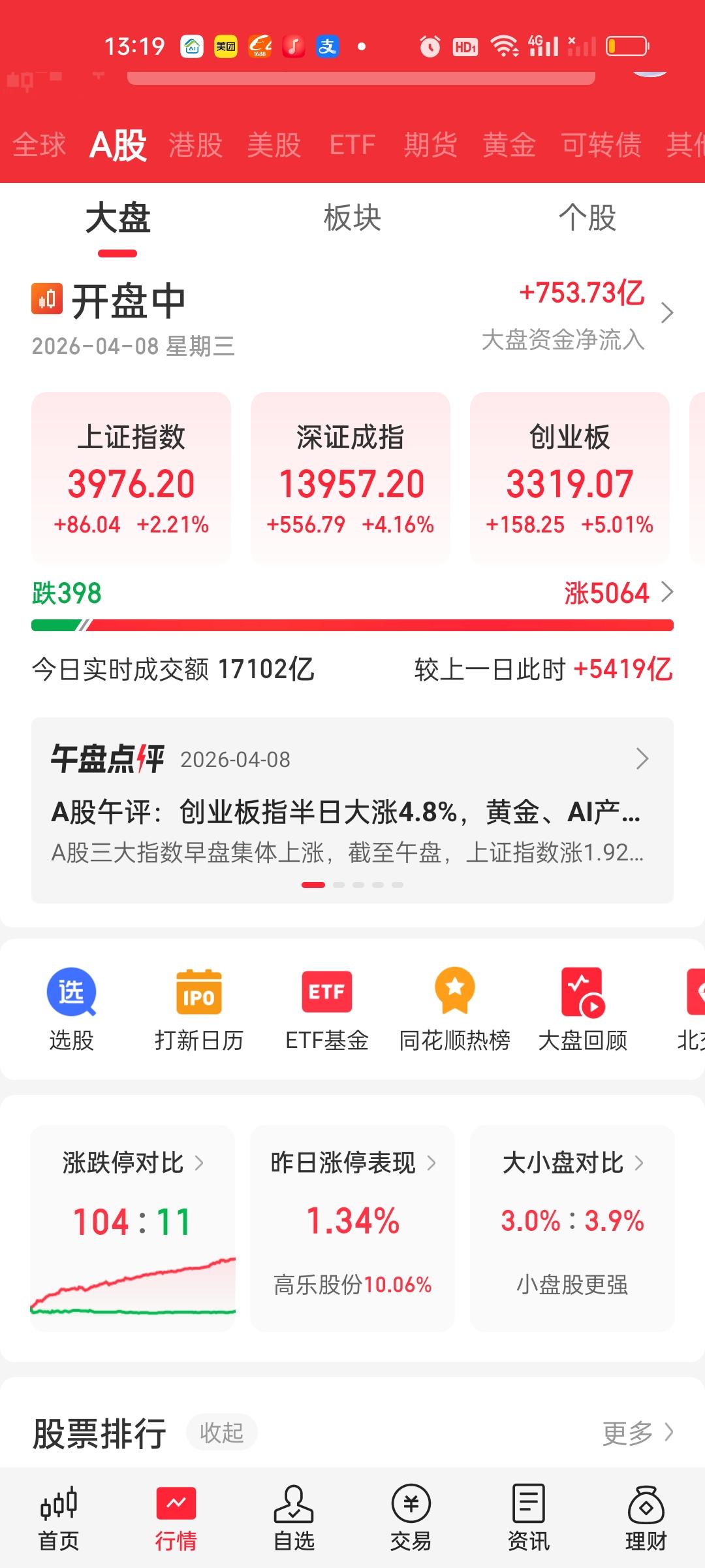 另外昨天大盘资金是净流出的,今天是大幅净流入的。昨天上涨的都是冷门板块,比如化工,油气资源类,所以看着有100多家涨停,实际赚钱效应并不强,今天因为资金大幅涌入,流入资金足够多可以分散到更多板块,所以板块呈现普涨态势。今天赚钱效应明显强于昨天。
