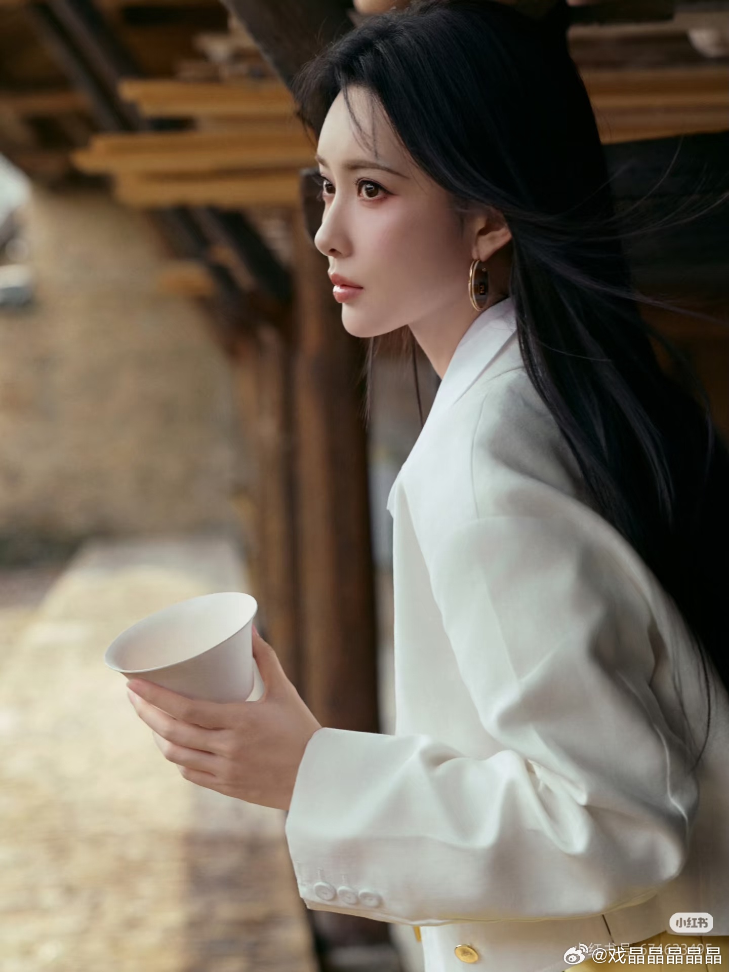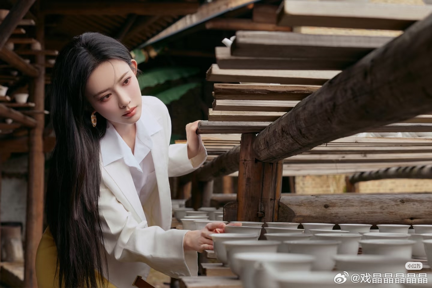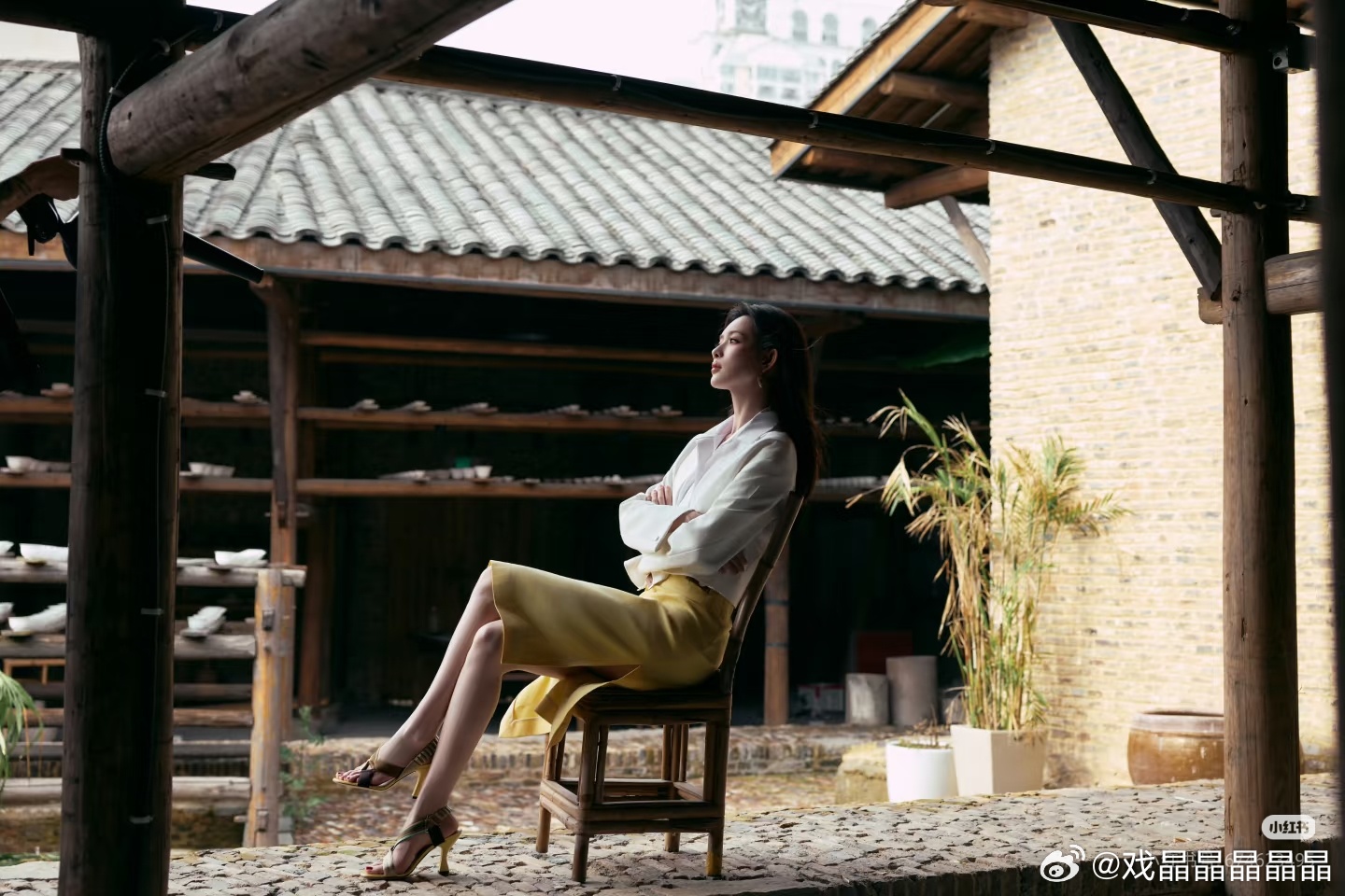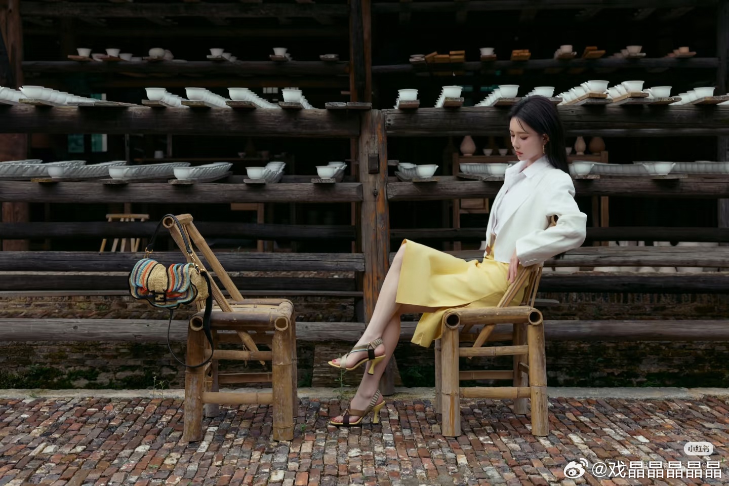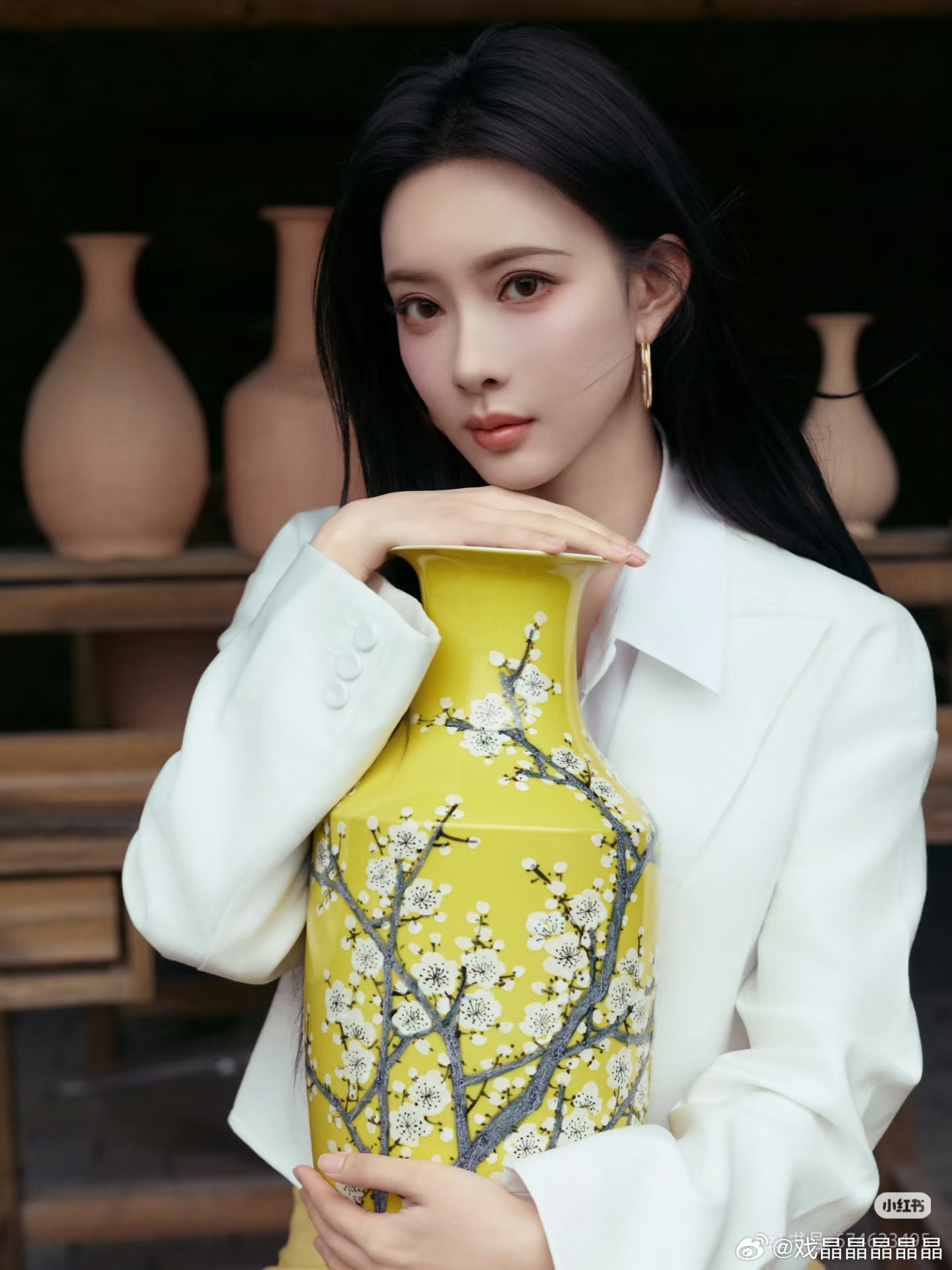 孟子义这次在Fendi景德镇活动的造型蛮好看的,一身纯白衬衫、白色皮夹克和黄色高腰半裙和景德镇的黄色陶瓷梅瓶和白色瓷器很搭。