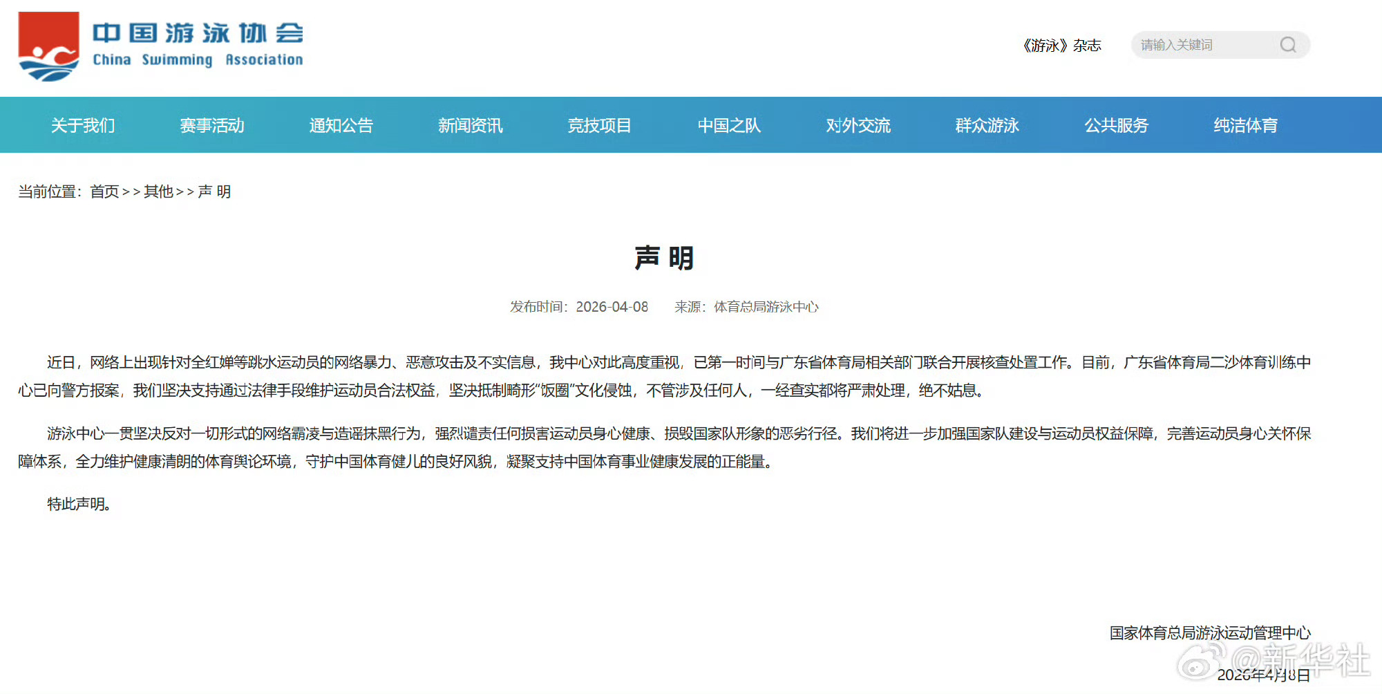 全红婵遭受网暴一事,广东省体育局二沙体育训练中心已向公安机关报警。同时国家体育总局游泳运动管理中心发布声明,坚决支持通过法律手段维护运动员合法权益,坚决抵制畸形“饭圈”文化侵蚀,不管涉及任何人,一经查实都将严肃处理,绝不姑息。