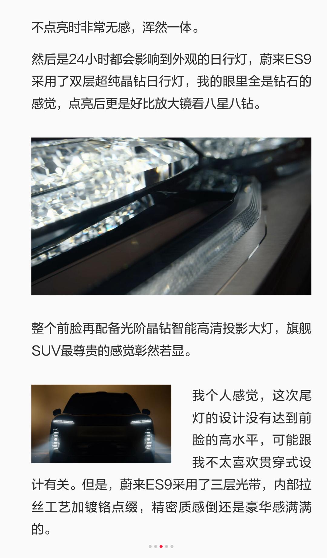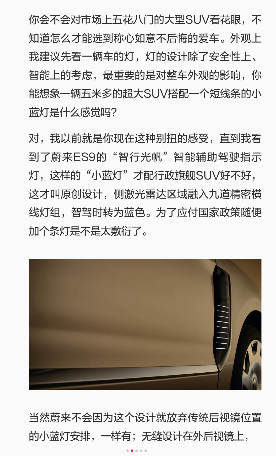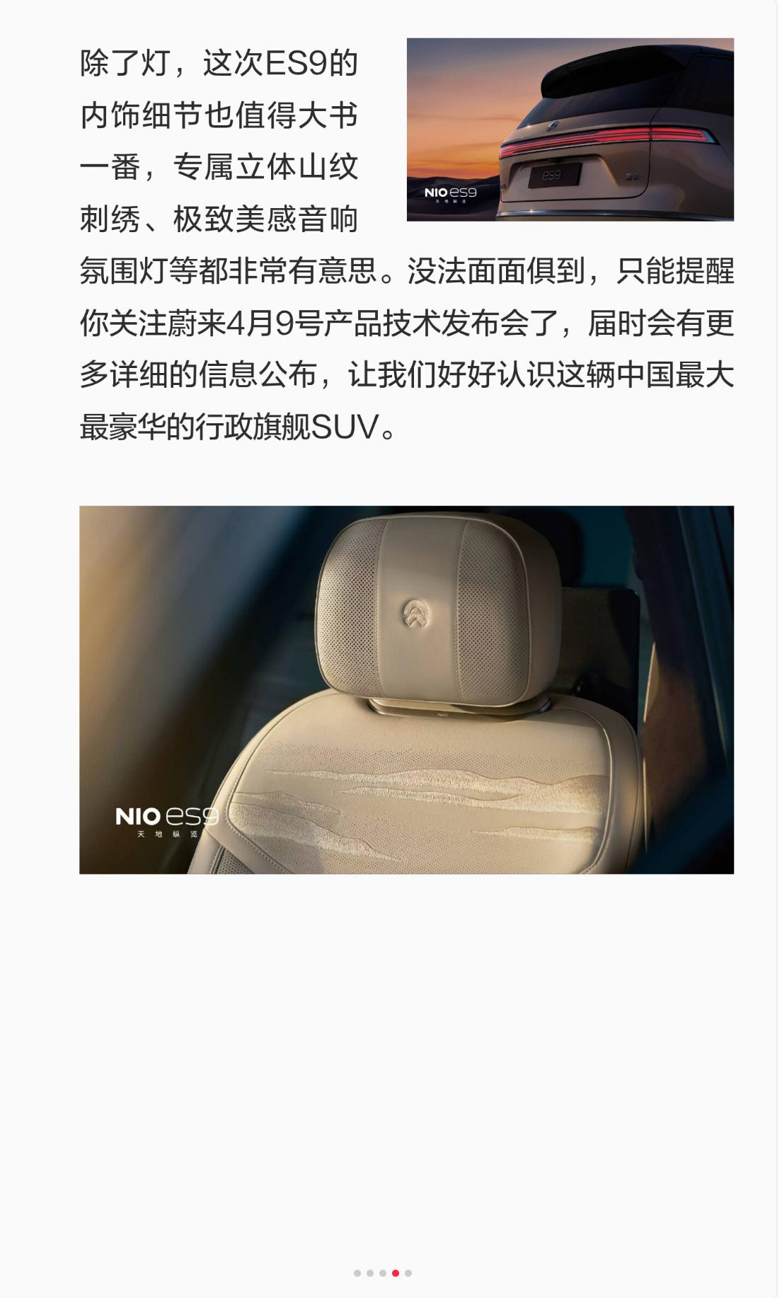 什么样的行政旗舰才叫“灯”峰造极 你会不会对市场上五花八门的大型SUV看花眼,不知道怎么才能选到称心如意不后悔的爱车。外观上我建议先看一辆车的灯,灯的设计除了安全性上、智能上的考虑,最重要的是对整车外观的影响,你能想象一辆五米多的超大SUV搭配一个短线条的小蓝灯是什么感觉吗? 对,我以前就是你现在这种别扭的感受,直到我看到了蔚来ES9的“智行光帆”智能辅助驾驶指示灯,这样的“小蓝灯”才配行政旗舰SUV好不好,这才叫原创设计,侧激光雷达区域融入九道精密横线灯组,智驾时转为蓝色。为了应付国家政策随便加个条灯是不是太敷衍了。 当然蔚来不会因为这个设计就放弃传统后视镜位置的小蓝灯安排,一样有;无缝设计在外后视镜上,不点亮时非常无感,浑然一体。 然后是24小时都会影响到外观的日行灯,蔚来ES9采用了双层超纯晶钻日行灯,我的眼里全是钻石的感觉,点亮后更是好比放大镜看八星八钻。 整个前脸再配备光阶晶钻智能高清投影大灯,旗舰SUV最尊贵的感觉彰然若显。 我个人感觉,这次尾灯的设计没有达到前脸的高水平,可能跟我不太喜欢贯穿式设计有关。但是,蔚来ES9采用了三层光带,内部拉丝工艺加镀铬点缀,精密质感倒还是豪华感满满的。 除了灯,这次ES9的内饰细节也值得大书一番,专属立体山纹刺绣、极致美感音响氛围灯等都非常有意思。没法面面俱到,只能提醒你关注蔚来4月9号产品技术发布会了,届时会有更多详细的信息公布,让我们好好认识这辆中国最大最豪华的行政旗舰SUV。蔚来