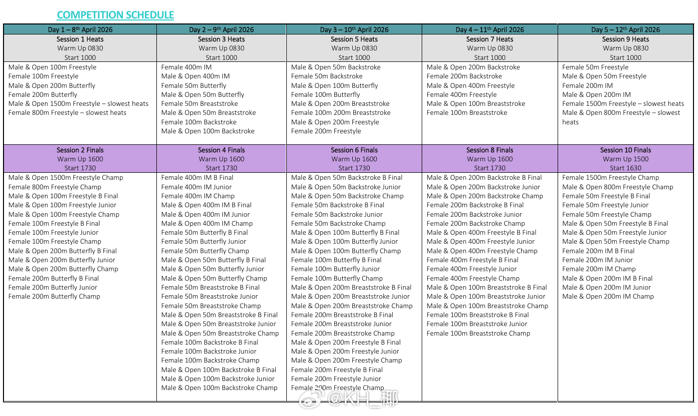 爱尔兰游泳锦标赛 (4.8-12)🇮🇪Daniel Wiffen:200/400/800/1500自🇮🇪John Shortt:50/100/200仰🇮🇪Nathan Wiffen:200/400/800/1500自🇮🇪Ellen Walshe:200/400混、100/200蝶、200/400自、100仰🇮🇪Mona McSharry:50/100/200蛙🇨🇳龚喜:50自、50蝶