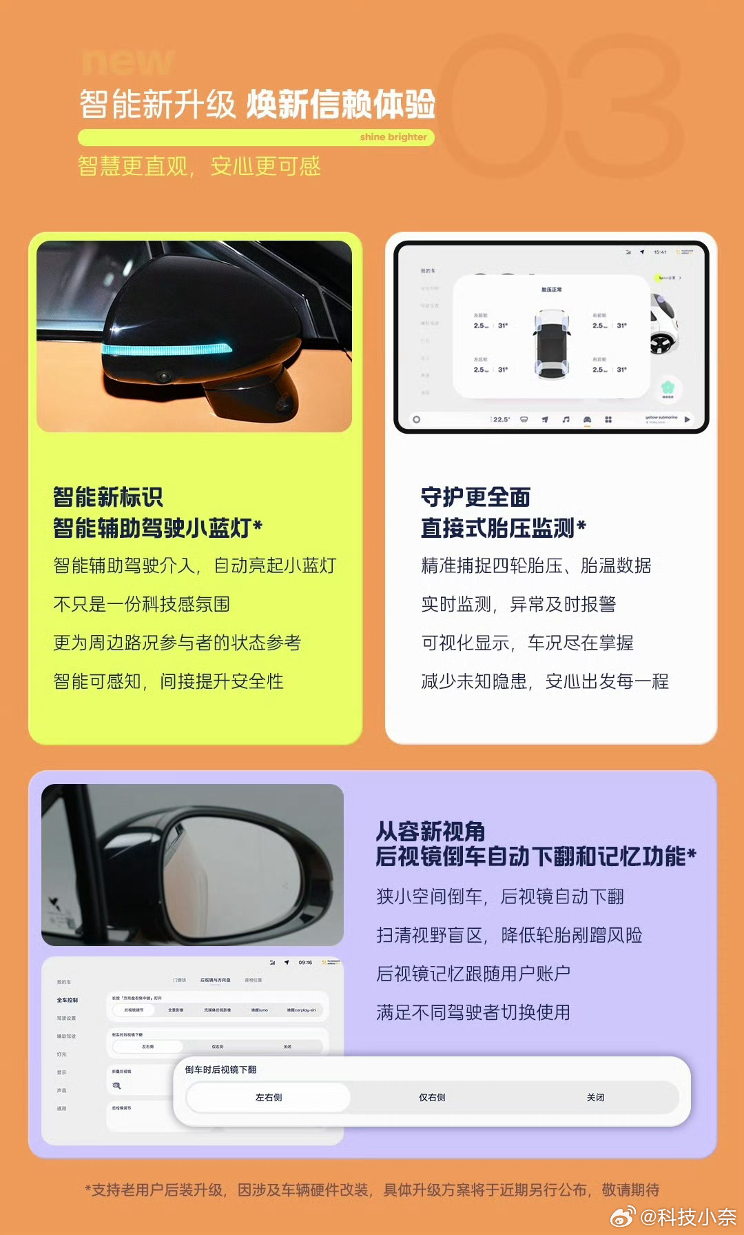 配置上加入直接式胎压监测、后视镜倒车下翻 + 记忆、智驾提示灯,车机也同步更新循迹倒车、氛围灯效等功能,整体实用性和体验都有提升。智驾数码团