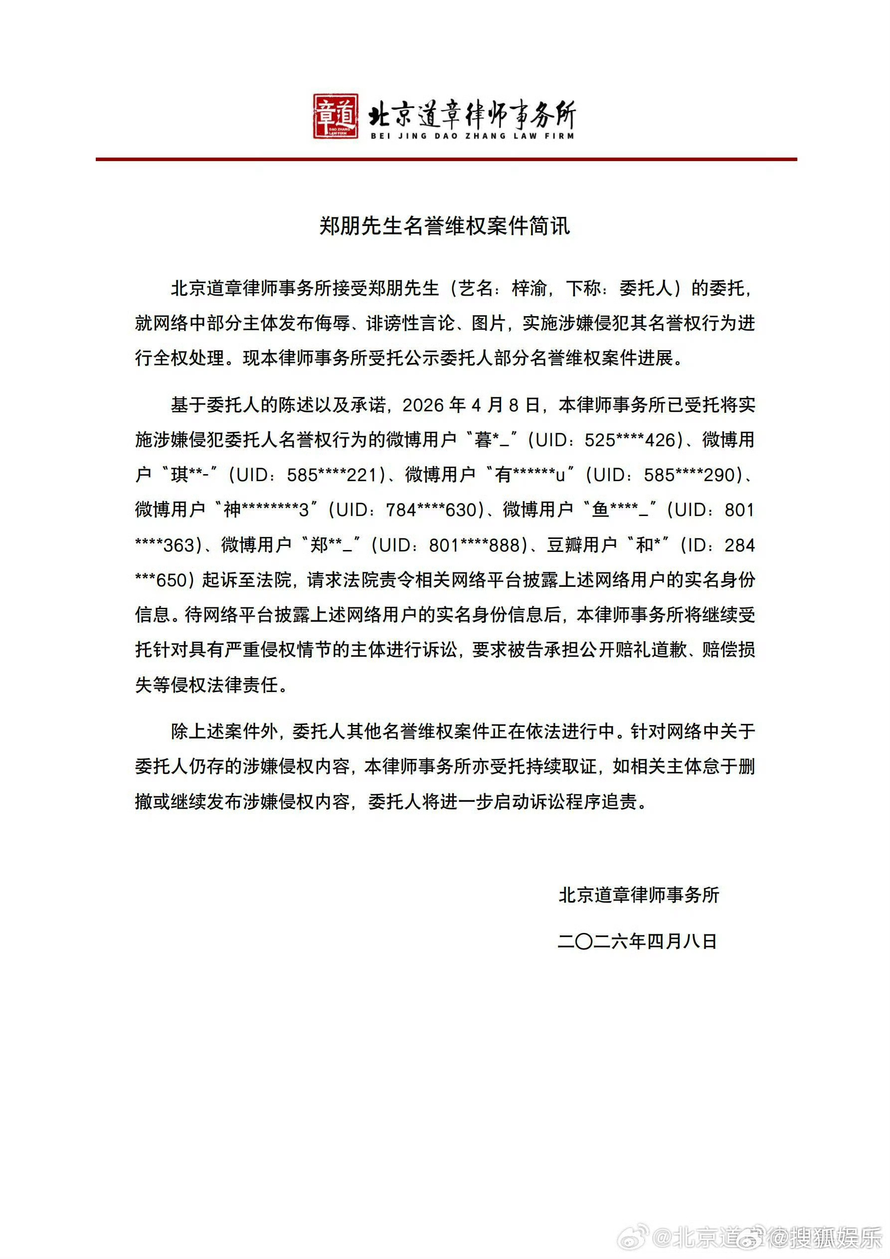 告黑最新进展🈶 公布梓渝名誉维权案件最新进展,并表示律师事务所将会持续取证。
