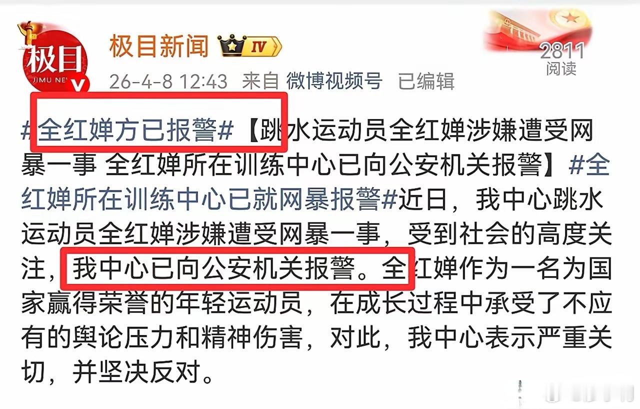 全红婵已报警从2022年婵宝东京奥运会夺冠后就开始网暴人家了,那时婵宝才15岁,太过分了!这样对待一个为国家荣誉做出突出贡献的运动员,而且还是一个孩子,这些人真不配为人。有组织的的团伙,估计有人收到别人的钱去攻击的。支持报警,一定要揪出幕后黑手,希望这次能彻底刹住体育圈这股歪风!小利说事