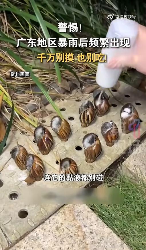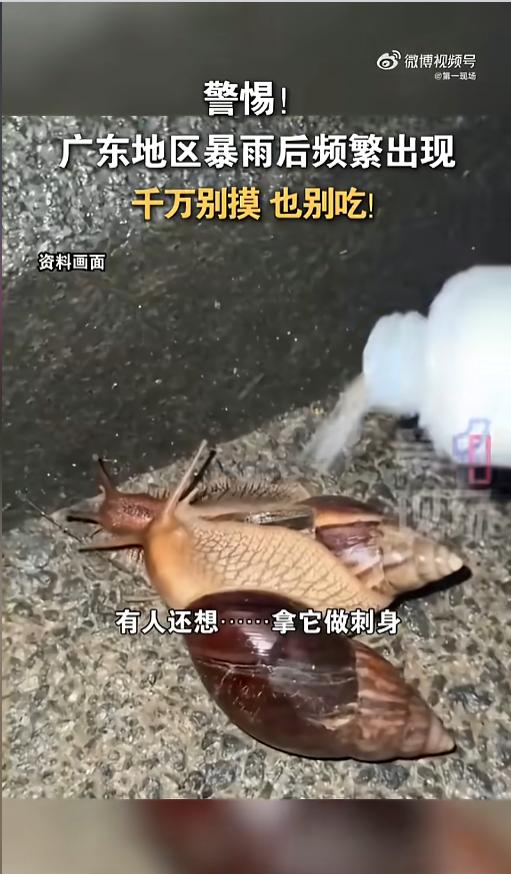 “摸一下都不行!”近日,广东,由于接连暴雨,天气潮湿,不少地方冒出来一堆巨型蜗牛。这个蜗牛个头比常见的大多了,看起来就肥美多汁,甚至还有人想拿来做刺身。可不兴这么干,这是非洲大蜗牛,一只里面能有上千条寄生虫呢!