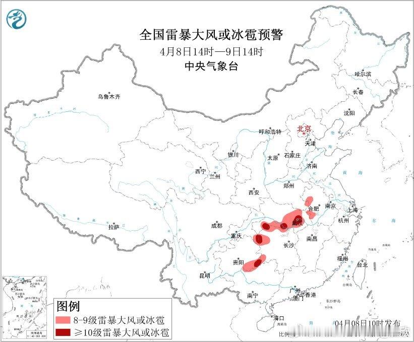 预计4月8日14时至9日14时,江汉、江淮西部、西南地区东部等地的部分地区将有8级以上雷暴大风或冰雹天气,其中,湖北东部和南部、湖南西北部、重庆东南部、贵州东南部等地的部分地区将有10级以上雷暴大风,最大风力可达11级以上,局地不排除出现龙卷的可能性;