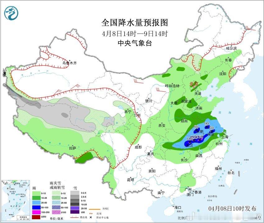 今天10时,中央气象台继续发布了暴雨蓝色预警,升级发布了强对流天气黄色预警:预计,4月8日14时至9日14时,江淮大部、江汉东部等地部分地区有大到暴雨,其中,安徽中部、湖北东部等地部分地区有大暴雨(100~160毫米)。