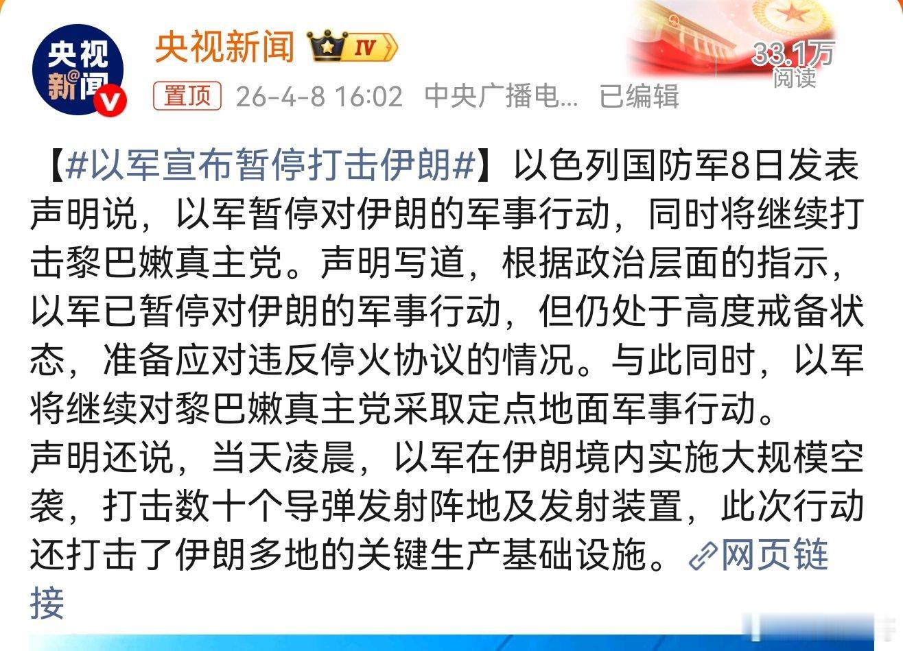 声明呼吁全体伊朗人民信任并支持这一由伊朗最高领导层监督的进程,严格避免分裂性言论。声明还表示,如果谈判失败,伊朗已做好战斗准备。以军宣布暂停打击伊朗