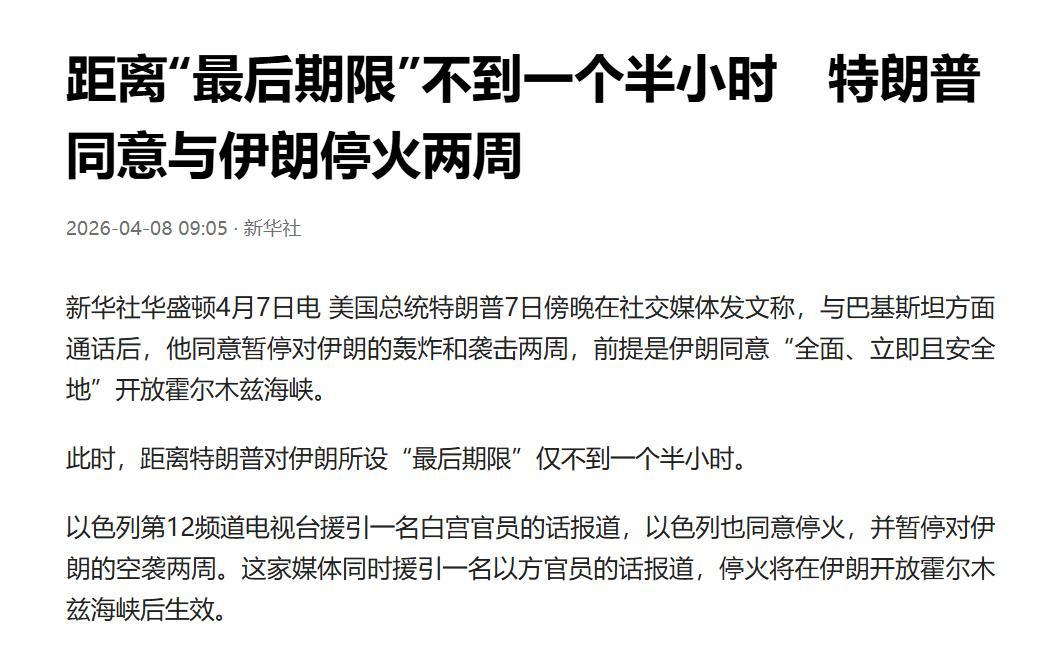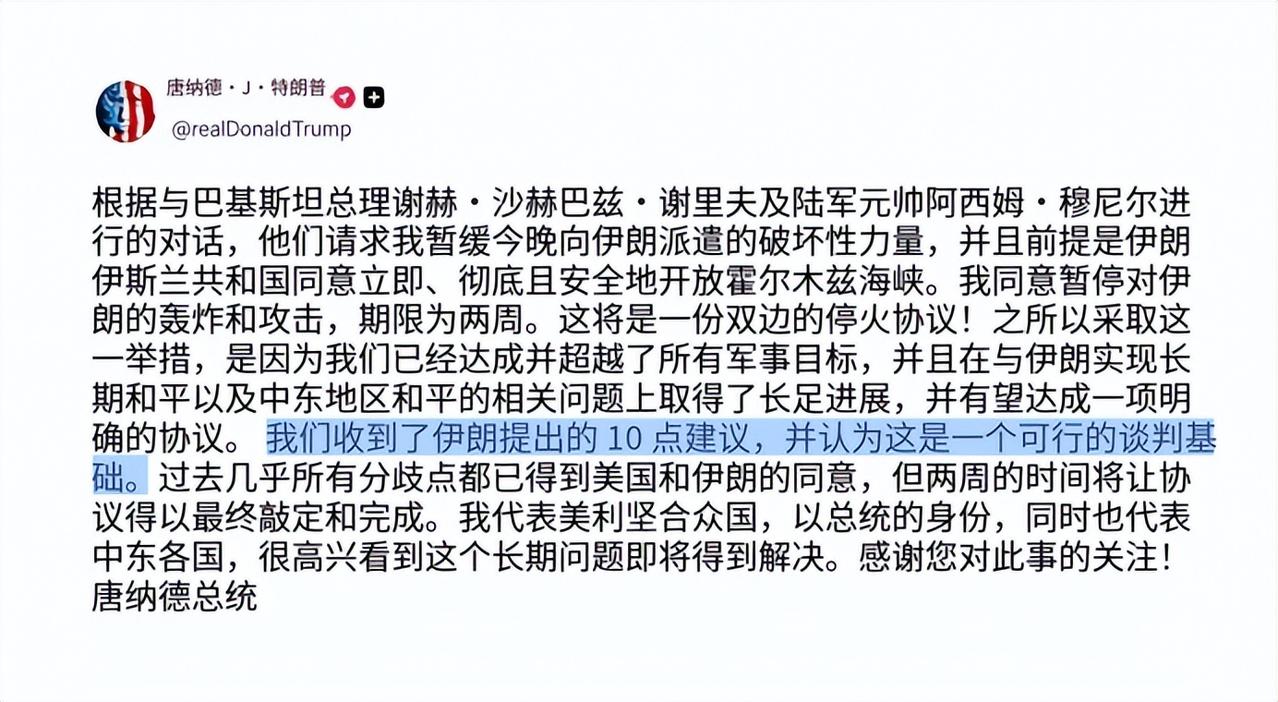 在距离威胁伊朗最后一个小时,特朗普同意了伊朗的十点诉求,双方这才达成临时停战协议,特朗普在媒体上发表停战宣言也一改往日“大赢特赢”的口气,而是谨慎介绍了谈判过程,停战理由,甚至公开承认美国接受了伊朗提出的10点建议,在此基础上进行完全停战谈判。