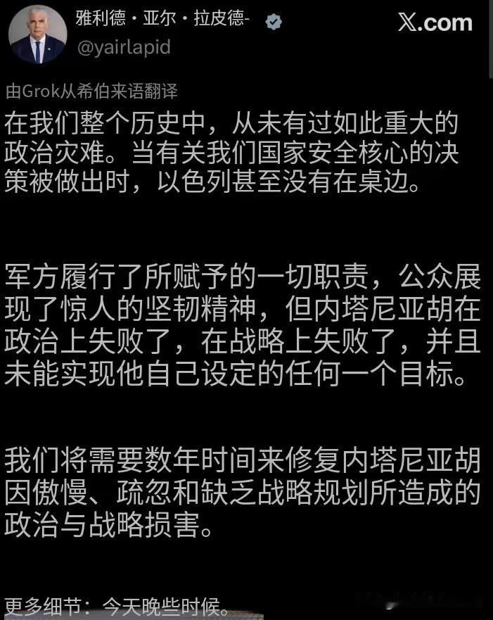 最后,拉皮德还强调,以色列将需要数年时间来修复内塔尼亚胡因傲慢、疏忽和缺乏战略规划所造成的政治与战略损害。