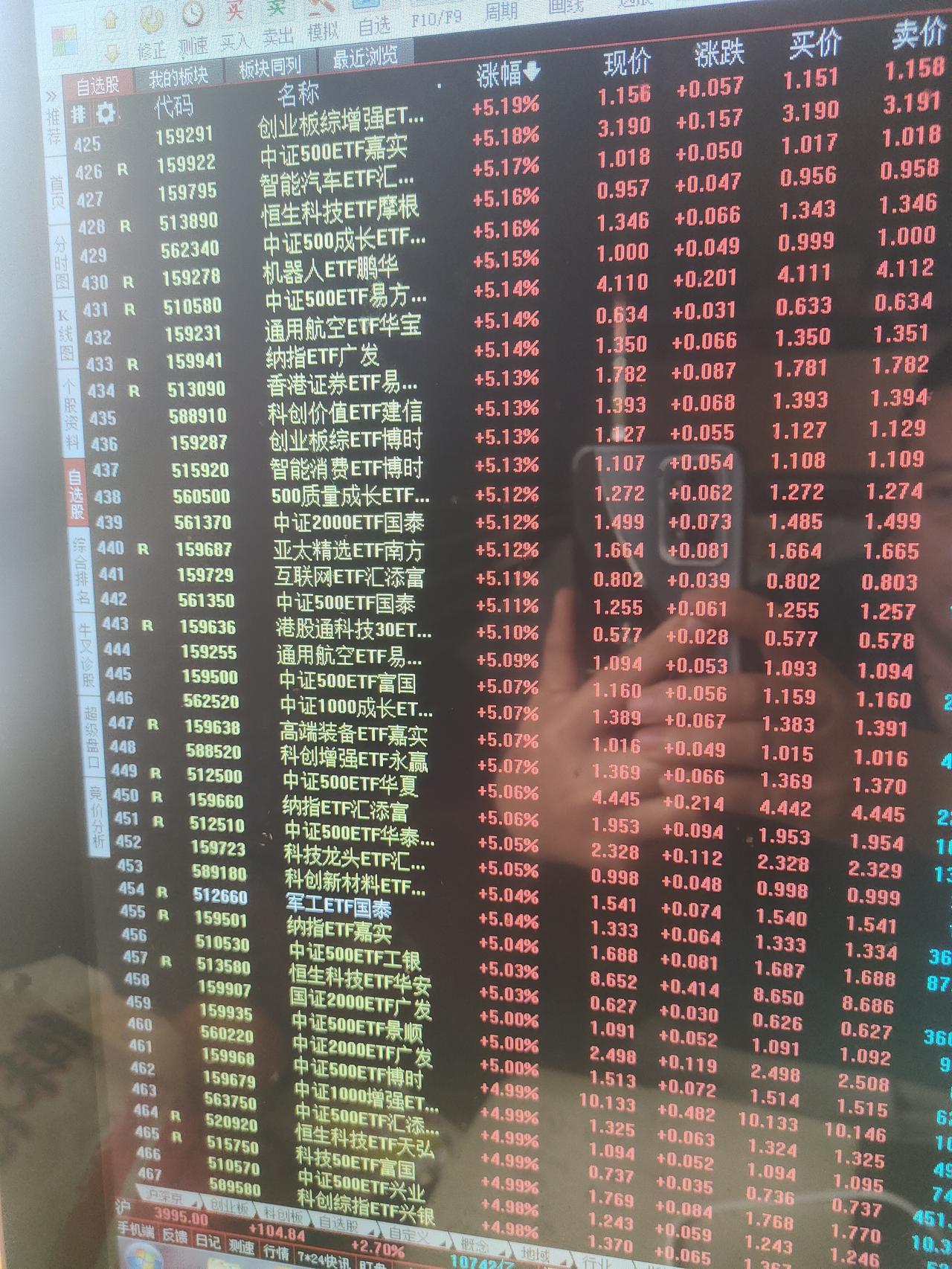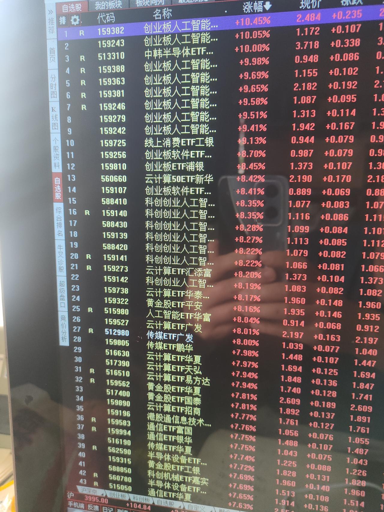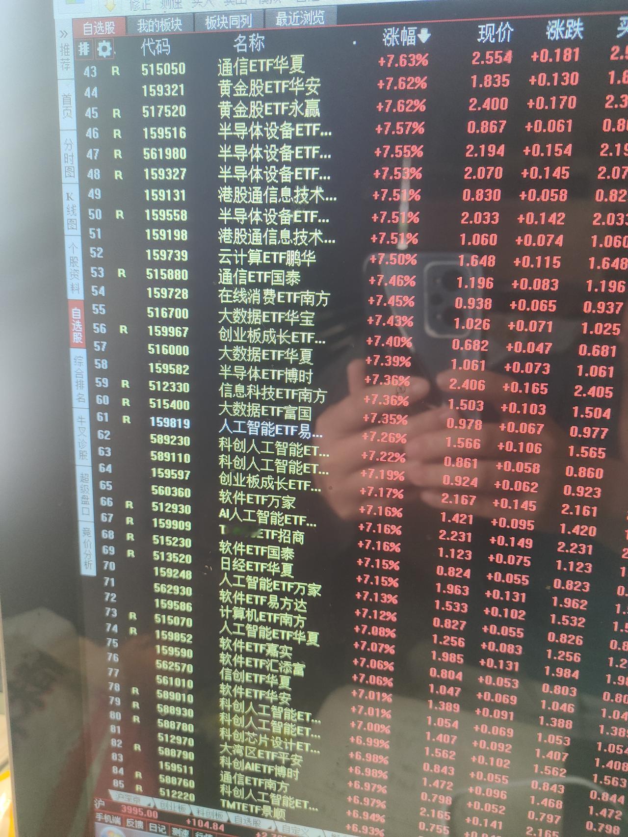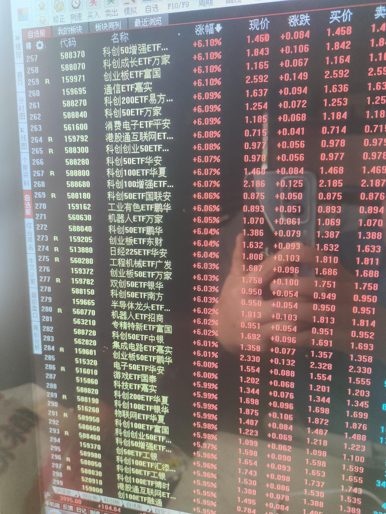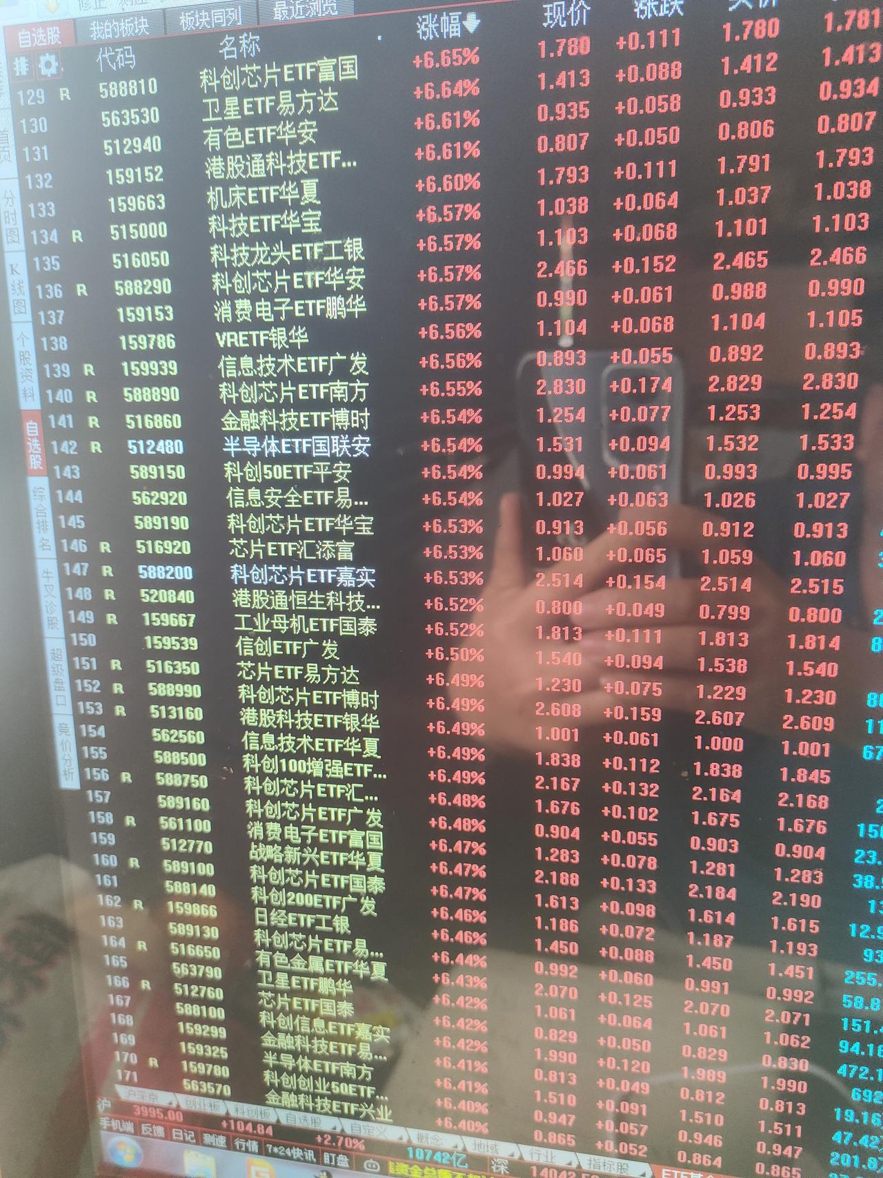 有人对今天这种级别的暴涨心里可能还没有直观概念。这样说吧,今天涨幅超过5%的场内ETF基金就有460支。估计涨幅超过4%的ETF基金在700支以上。科技板块的细分领域几乎全部是暴涨的状态,人工智能,半导体,CPO,通信,存储芯片,固态电池,光伏,可控核聚变,机器人,通信,云计算,软件,商用航天,创业板,科创板等等。