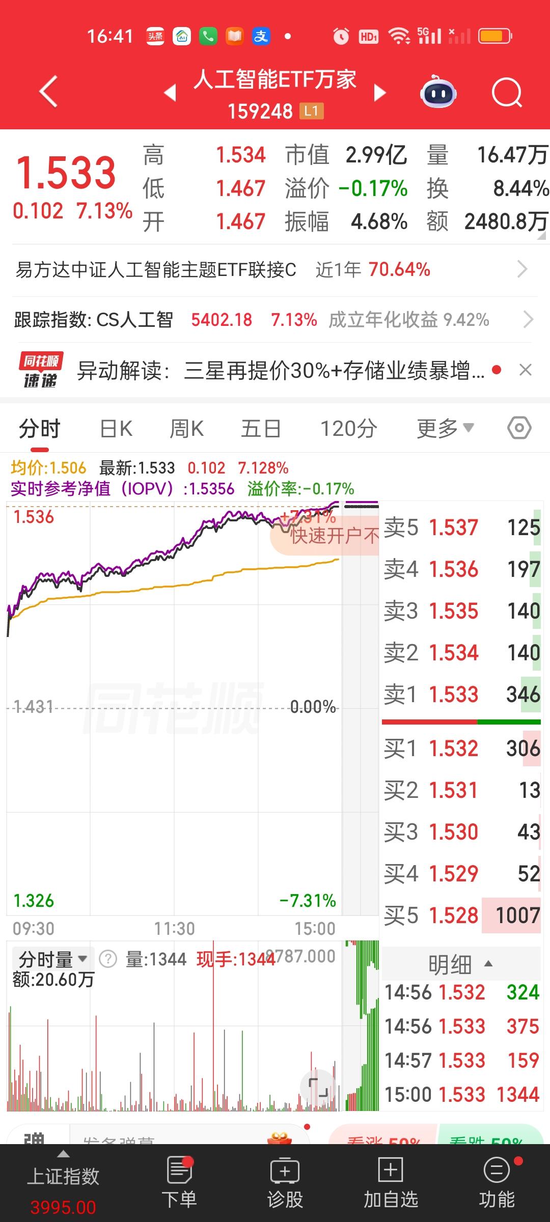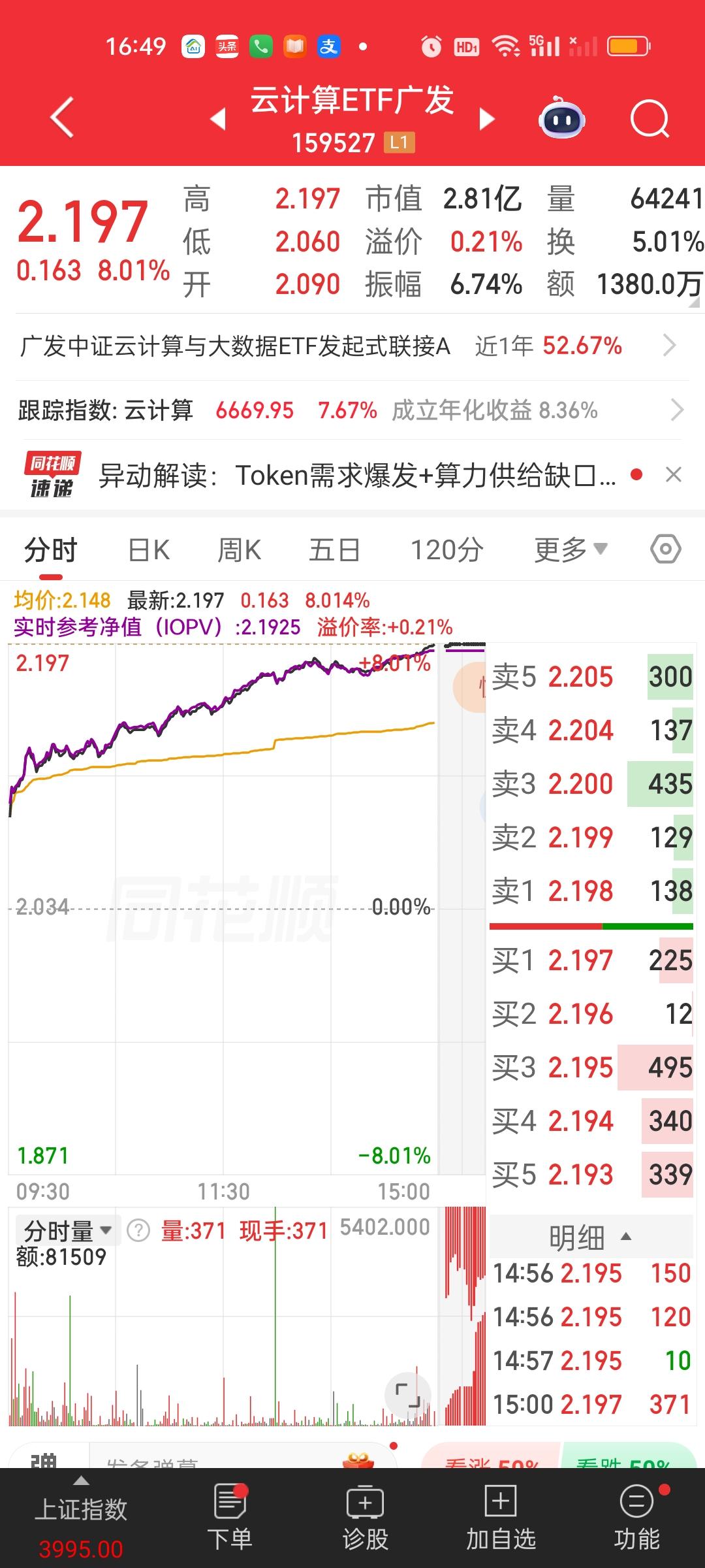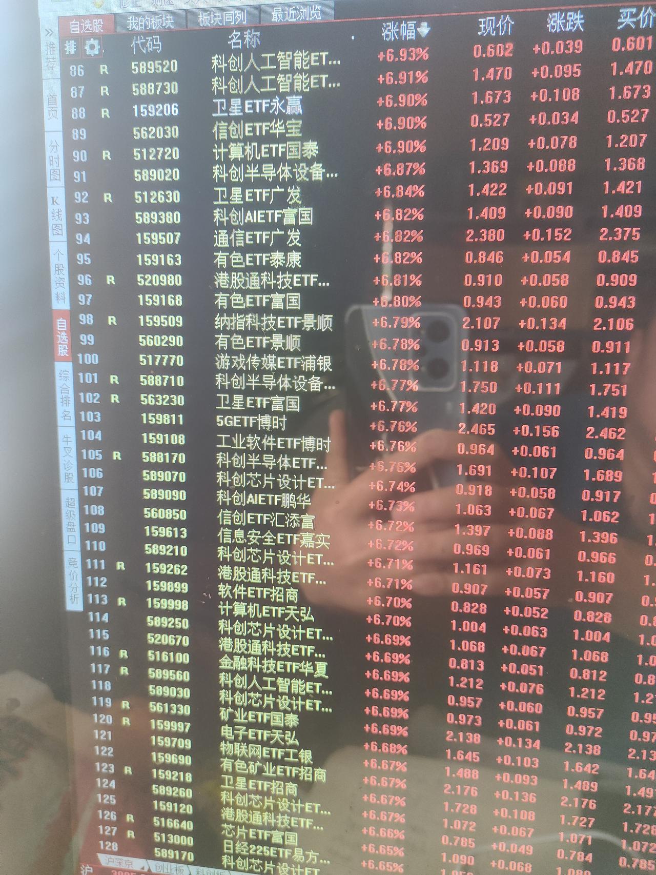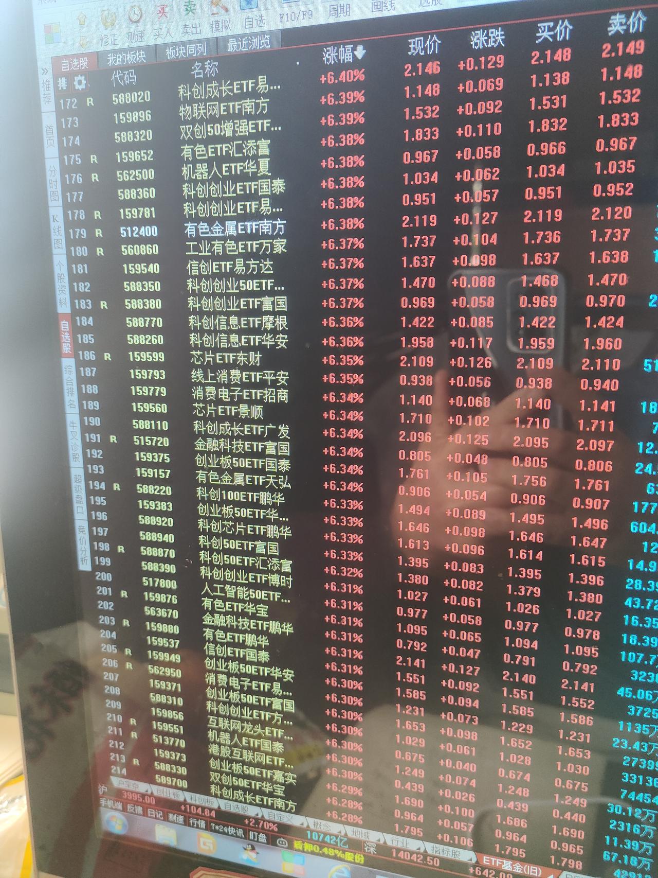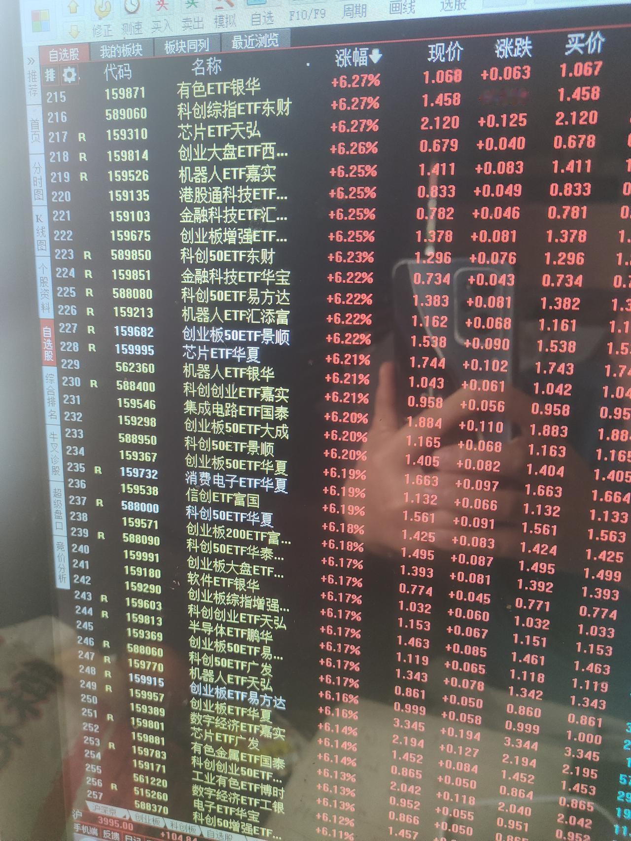 有人对今天这种级别的暴涨心里可能还没有直观概念。这样说吧,今天涨幅超过5%的场内ETF基金就有460支。估计涨幅超过4%的ETF基金在700支以上。科技板块的细分领域几乎全部是暴涨的状态,人工智能,半导体,CPO,通信,存储芯片,固态电池,光伏,可控核聚变,机器人,通信,云计算,软件,商用航天,创业板,科创板等等。