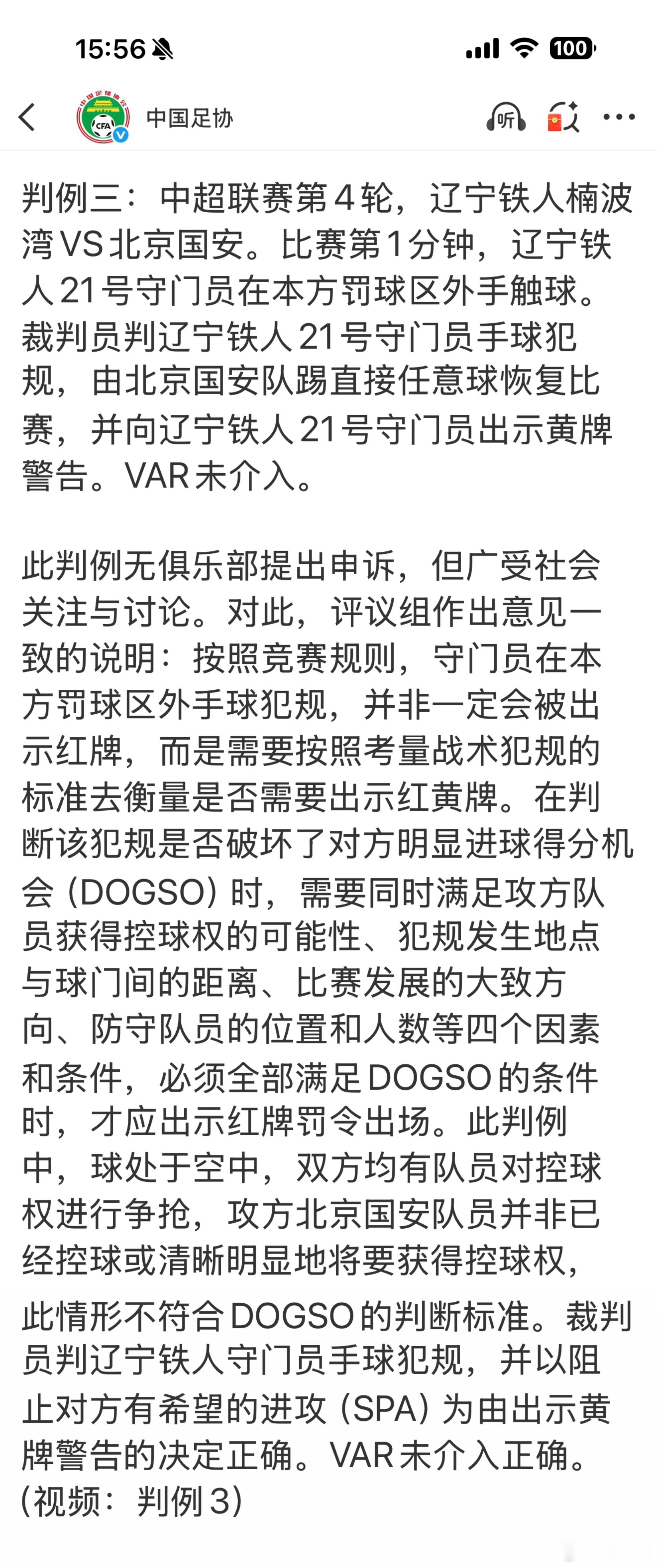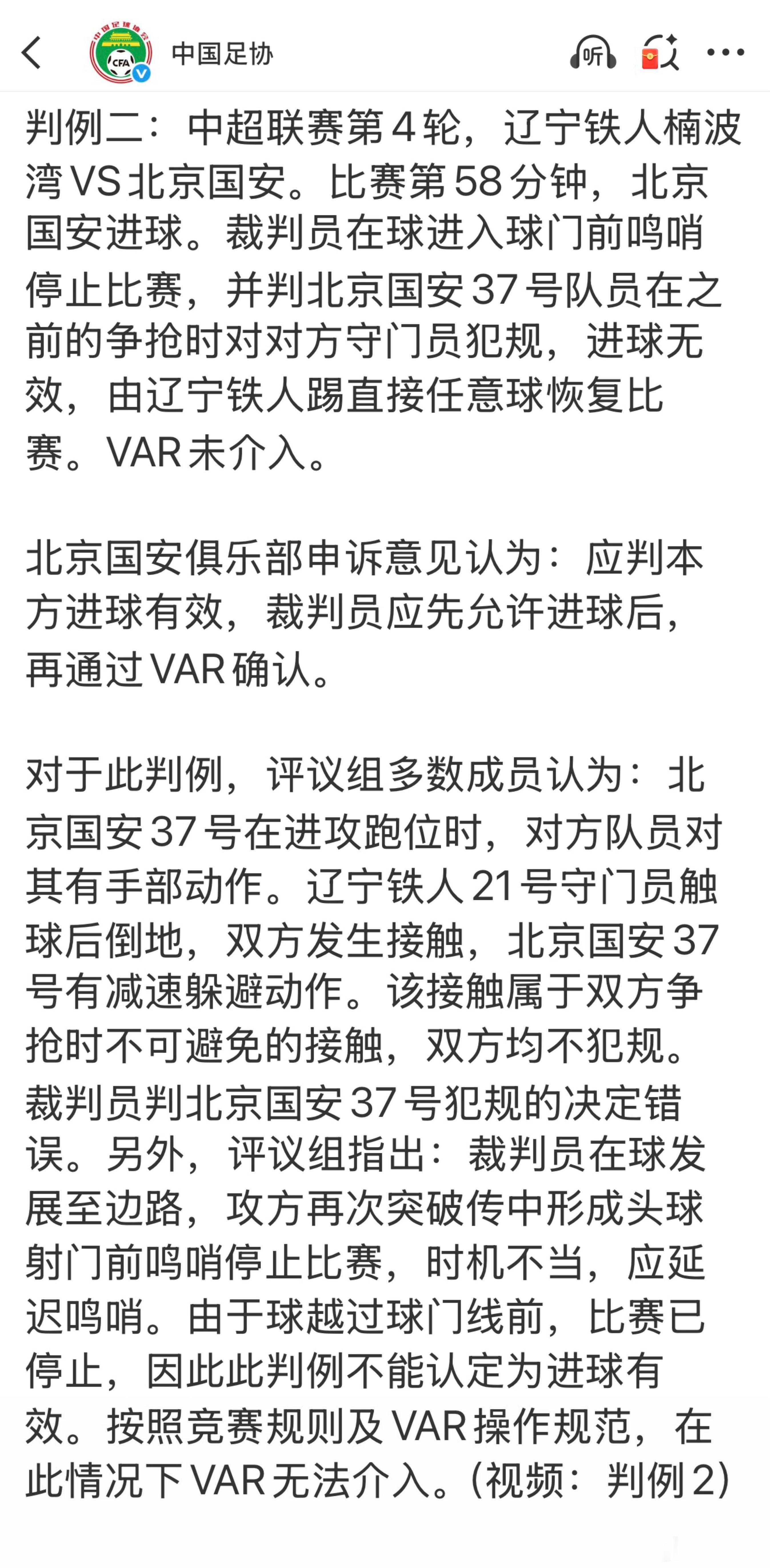 最新一期裁判评议,提到国安客场和辽宁铁人比赛中两个判罚。其中比赛刚开始铁人门将的禁区外手接球(图一)。评议认为:攻方北京国安队员并非已经控球或清晰明显地将要获得控球权,此情形不符合DOGSO的判断标准。裁判员判辽宁铁人守门员手球犯规,并以阻止对方有希望的进攻(SPA)为由出示黄牌警告的决定正确。VAR未介入正确。 而关于第 58 分钟国安那个鸣哨后进球(图三)。评议组多数成员认为:北京国安37号在进攻跑位时,对方队员对其有手部动作。辽宁铁人21号守门员触球后倒地,双方发生接触,北京国安37号有减速躲避动作。该接触属于双方争抢时不可避免的接触,双方均不犯规。裁判员判北京国安37号犯规的决定错误。另外,评议组指出:裁判员在球发展至边路,攻方再次突破传中形成头球射门前鸣哨停止比赛,时机不当,应延迟鸣哨。