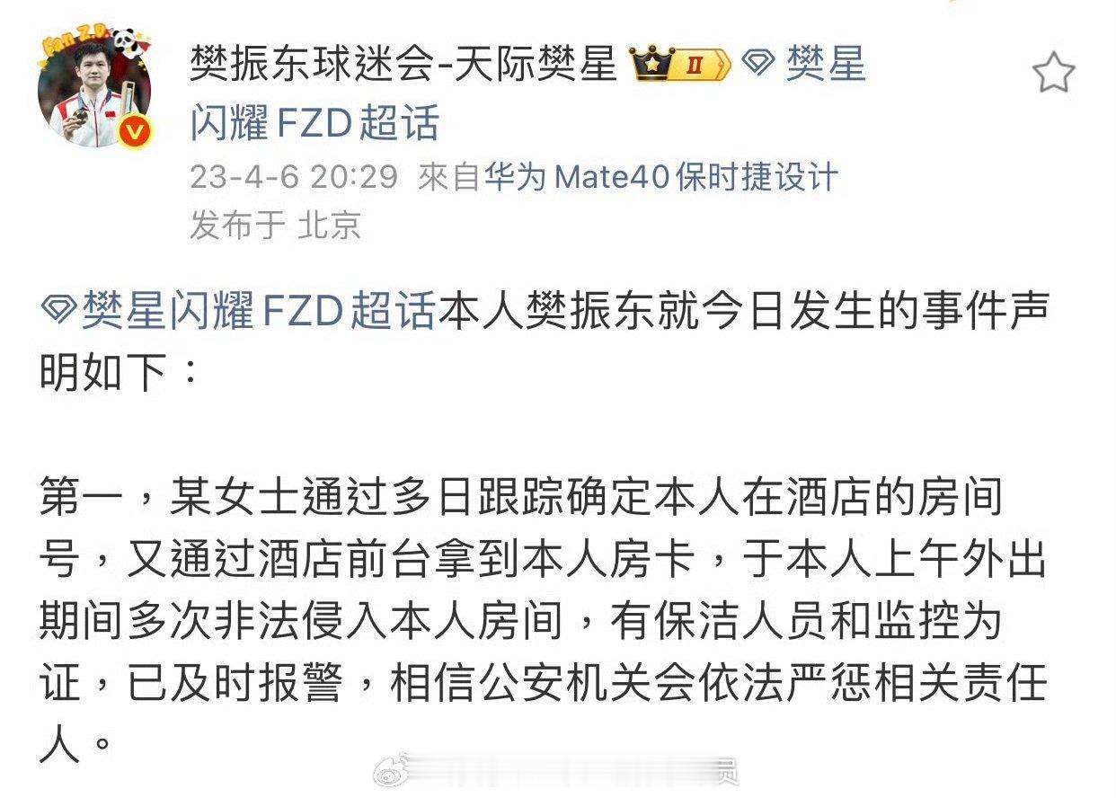 樊振东曾因被陌生人闯房间感到恐慌 20230406—20260408,三年了,至今涉事酒店和协会并未对樊振东房间被入侵一事做出任何道歉和回应。而乒丝却将樊振东受到的受害当做乐子,嘲讽他。以及顺便重温一下樊振东身份证被队友粉丝拿开当做红包口令后,媒体是怎么做的吧。 (