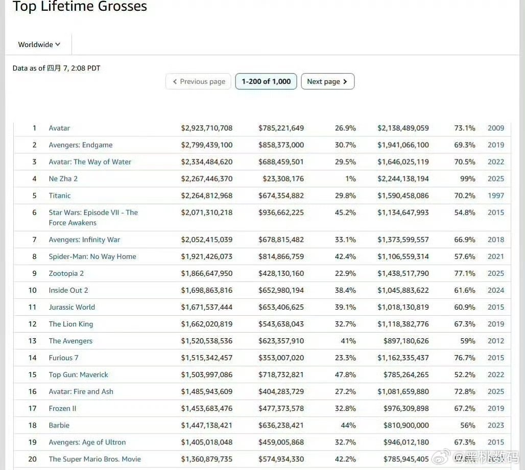哪吒2票房升至全球第4时隔一年多,根据最新数据统计哪吒2已经到全球影史第四,这真