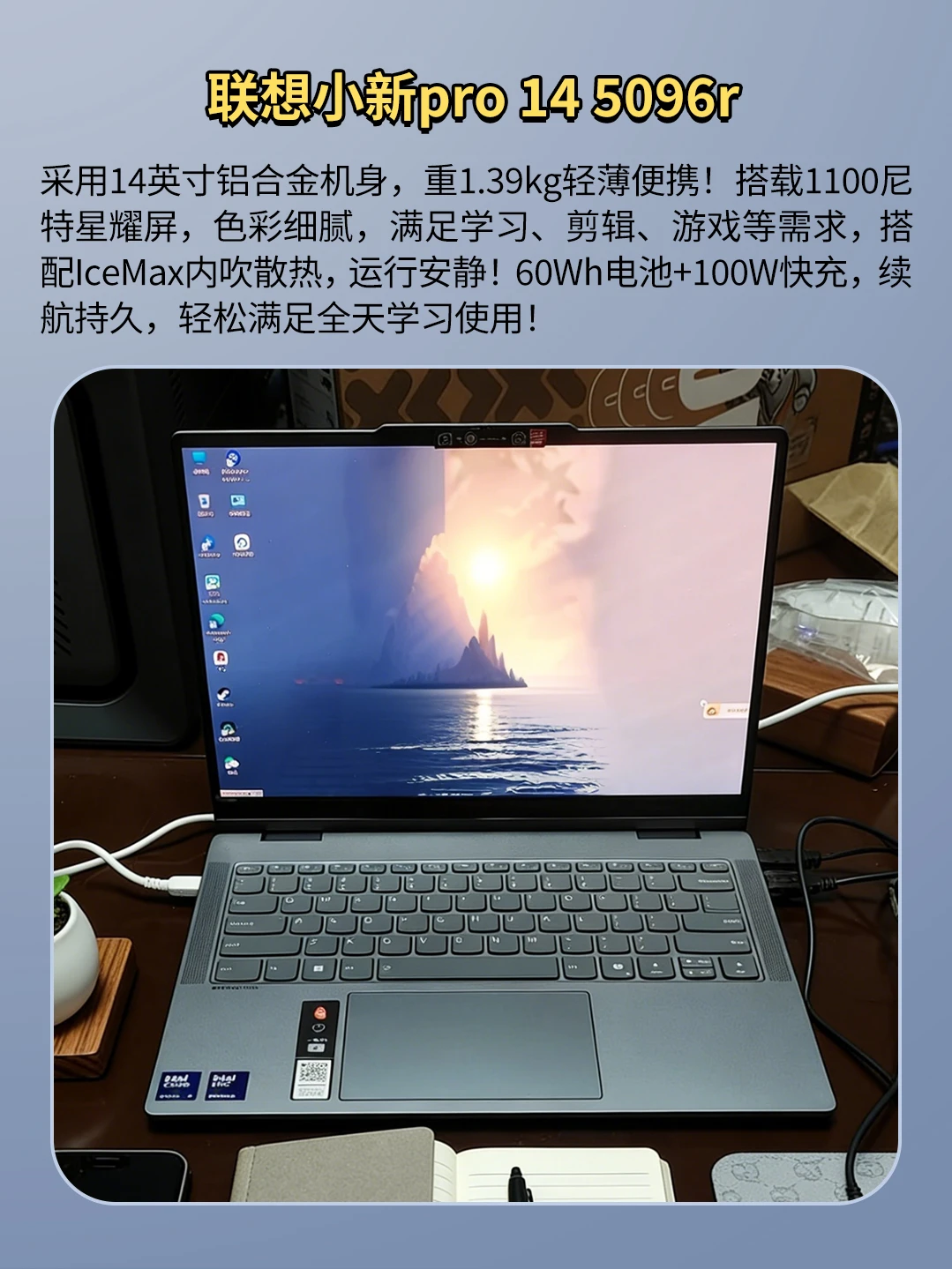 采用14英寸铝合金机身,重1.39kg轻薄便携!搭载1100尼特星耀屏,色彩细腻,可满足学习、剪辑、游戏等需求,搭配IceMax内吹散热,运行安静!60Wh电池+100W快充,续航持久!