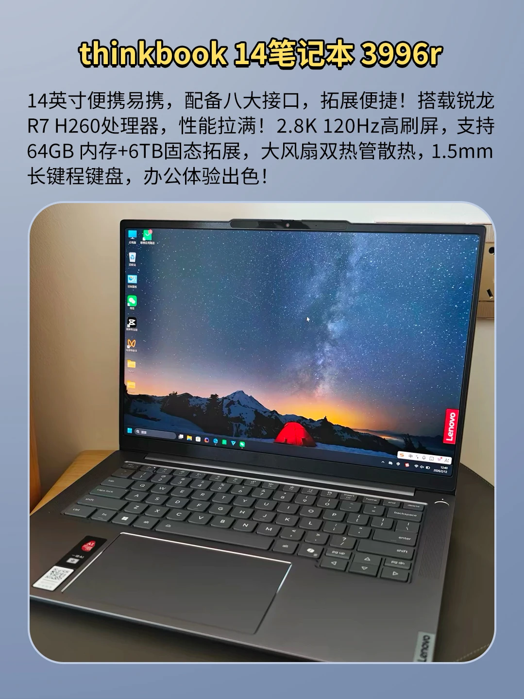 14英寸便携易携,配备八大接口,拓展便捷!搭载锐龙 R7 H260处理器,性能拉满!2.8K 120Hz高刷屏,大风扇双热管散热,1.5mm长键程键盘,办公体验出色!