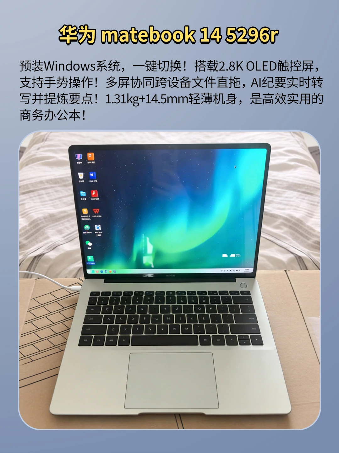 预装Windows系统,一键切换!搭载2.8K OLED触控屏,支持手势操作!多屏协同跨设备文件直拖,AI纪要实时转写并提炼要点!1.31kg+14.5mm轻薄机身,是高效实用的商务办公本!