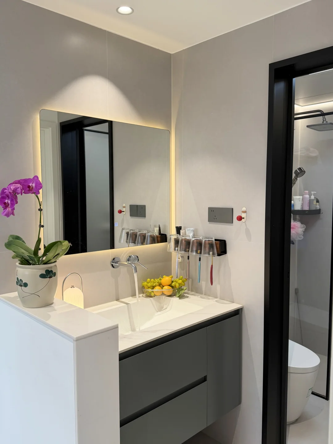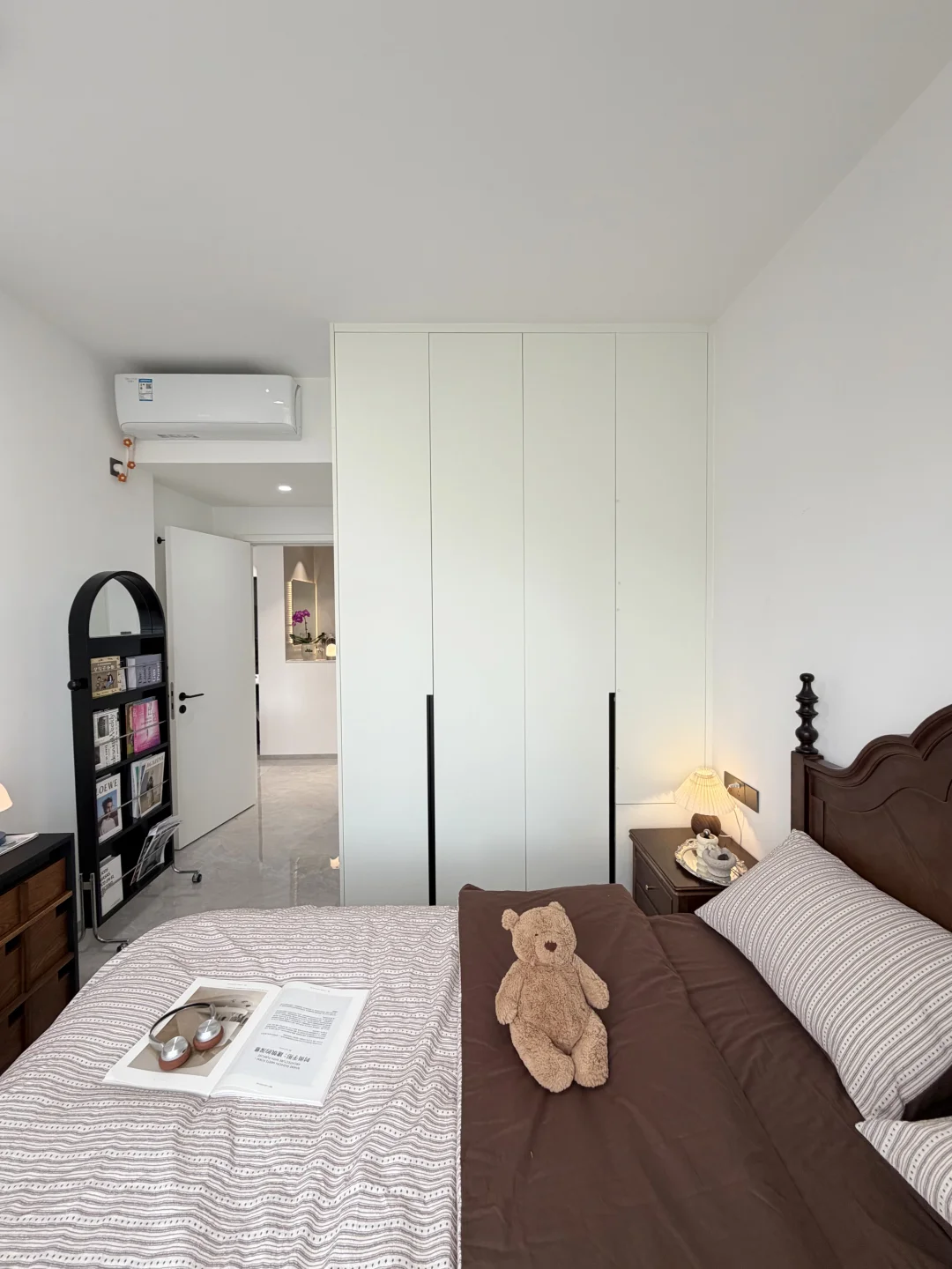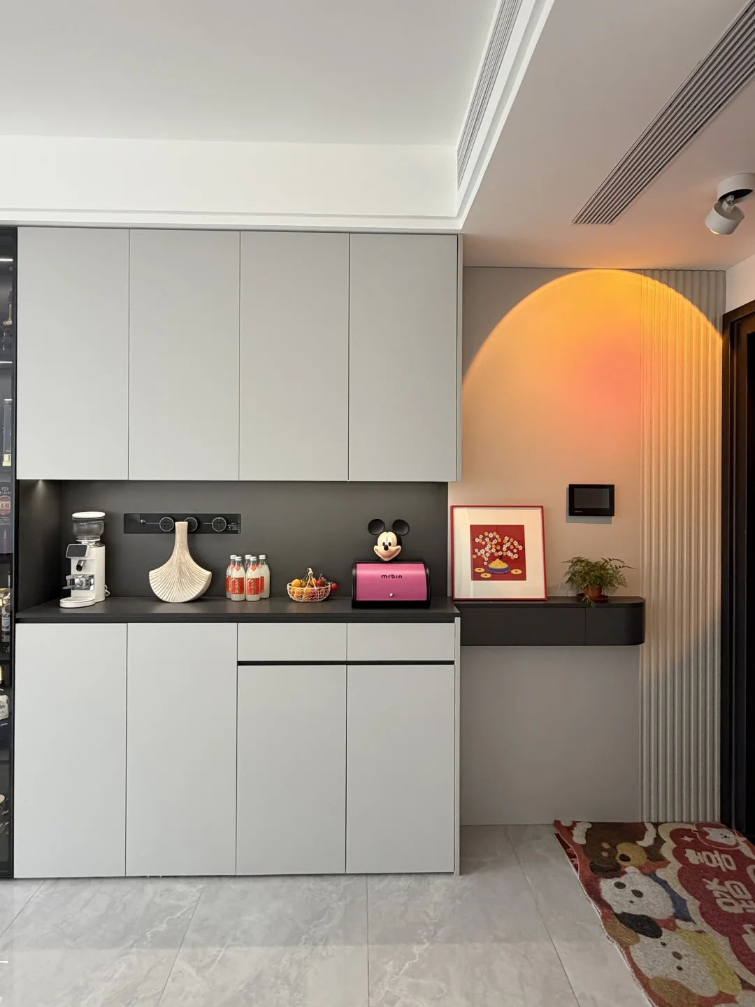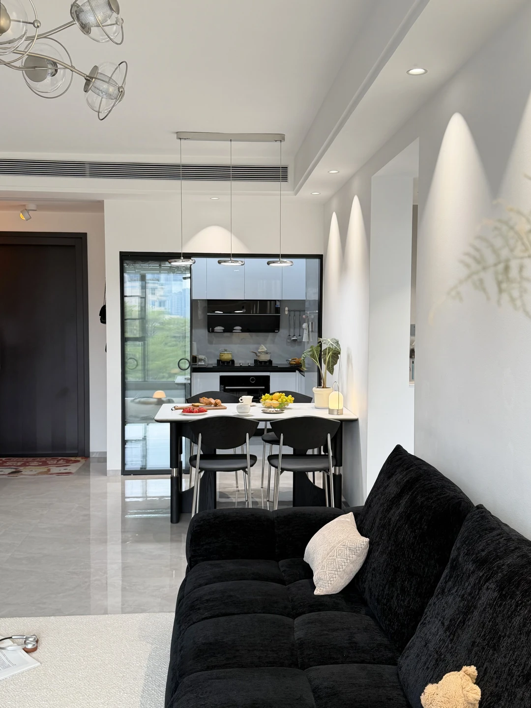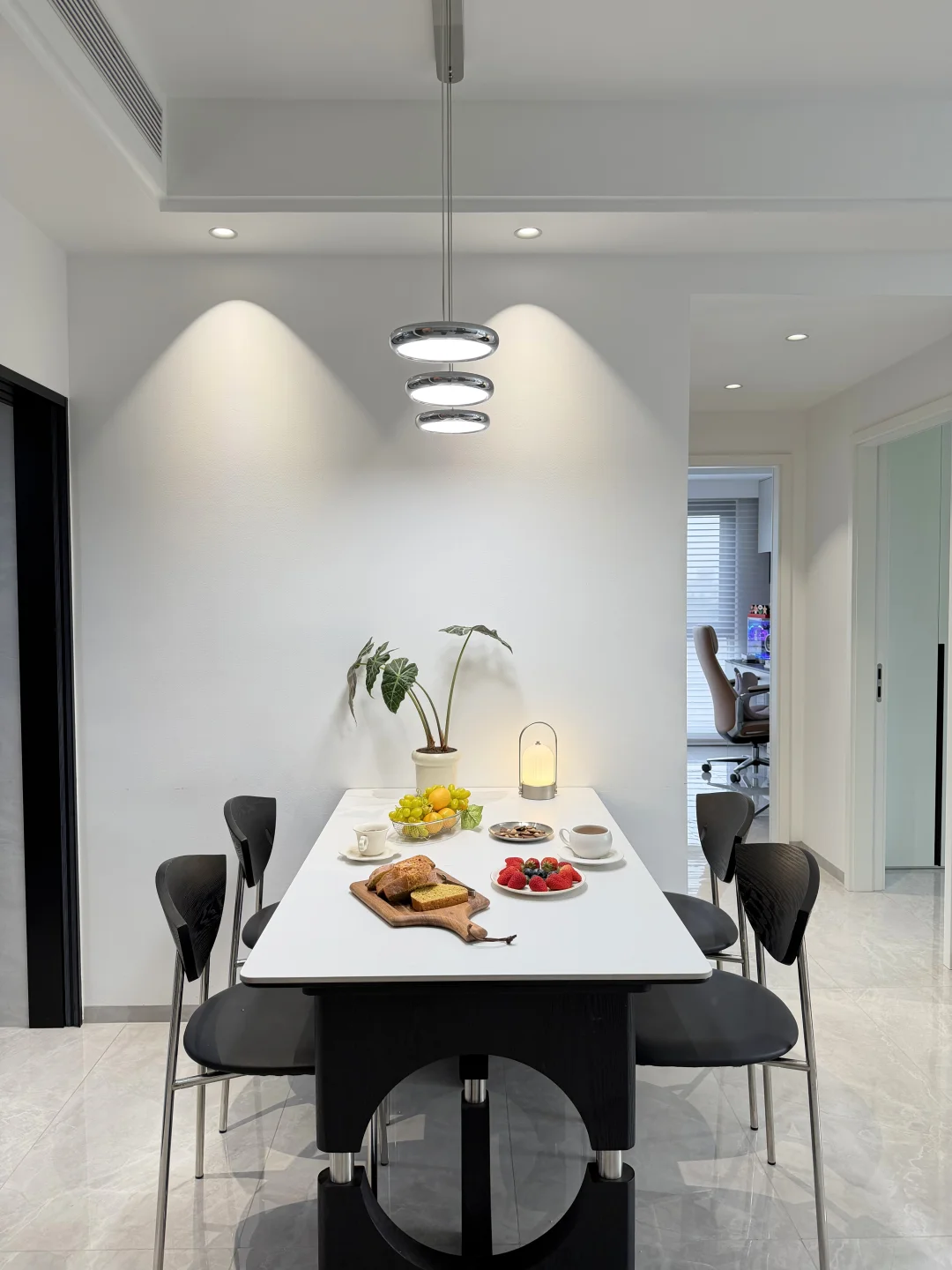 ·墙面统一刷白色乳胶漆,走黑白灰现代风路线,再用暖色灯光去中和,住起来不会冰冷,反而很舒服
