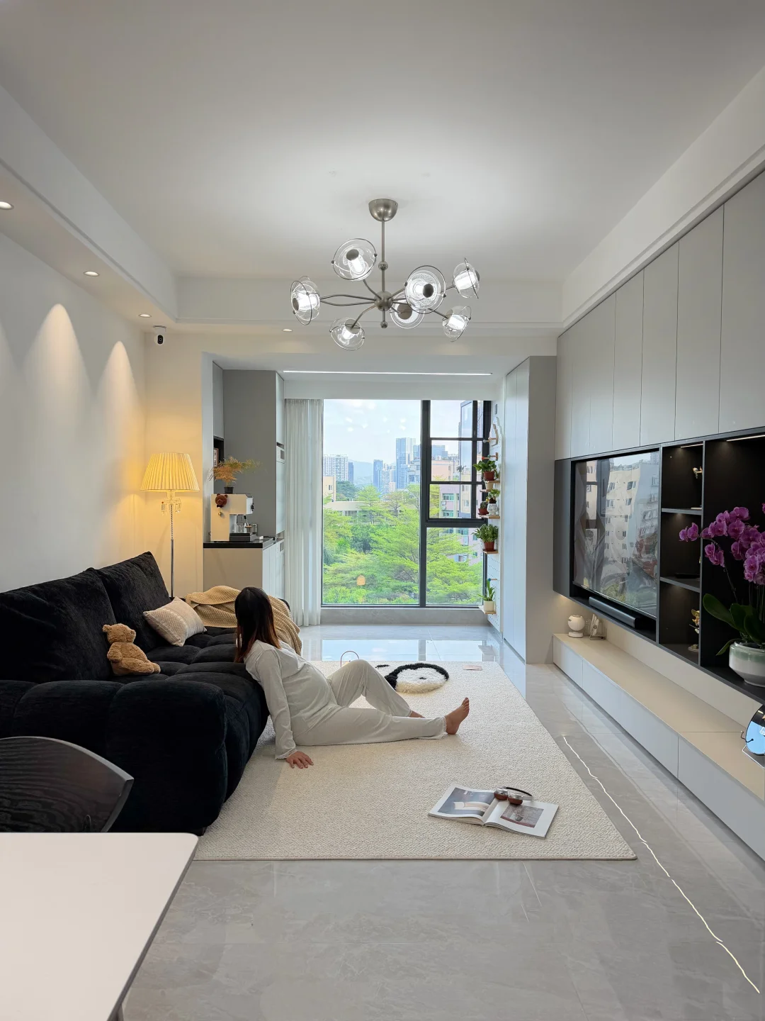 ·客厅开间3.5m,整面做了35cm深的满墙收纳柜,沙发背景墙2.9m,小空间也能把收纳和比例都兼顾到~