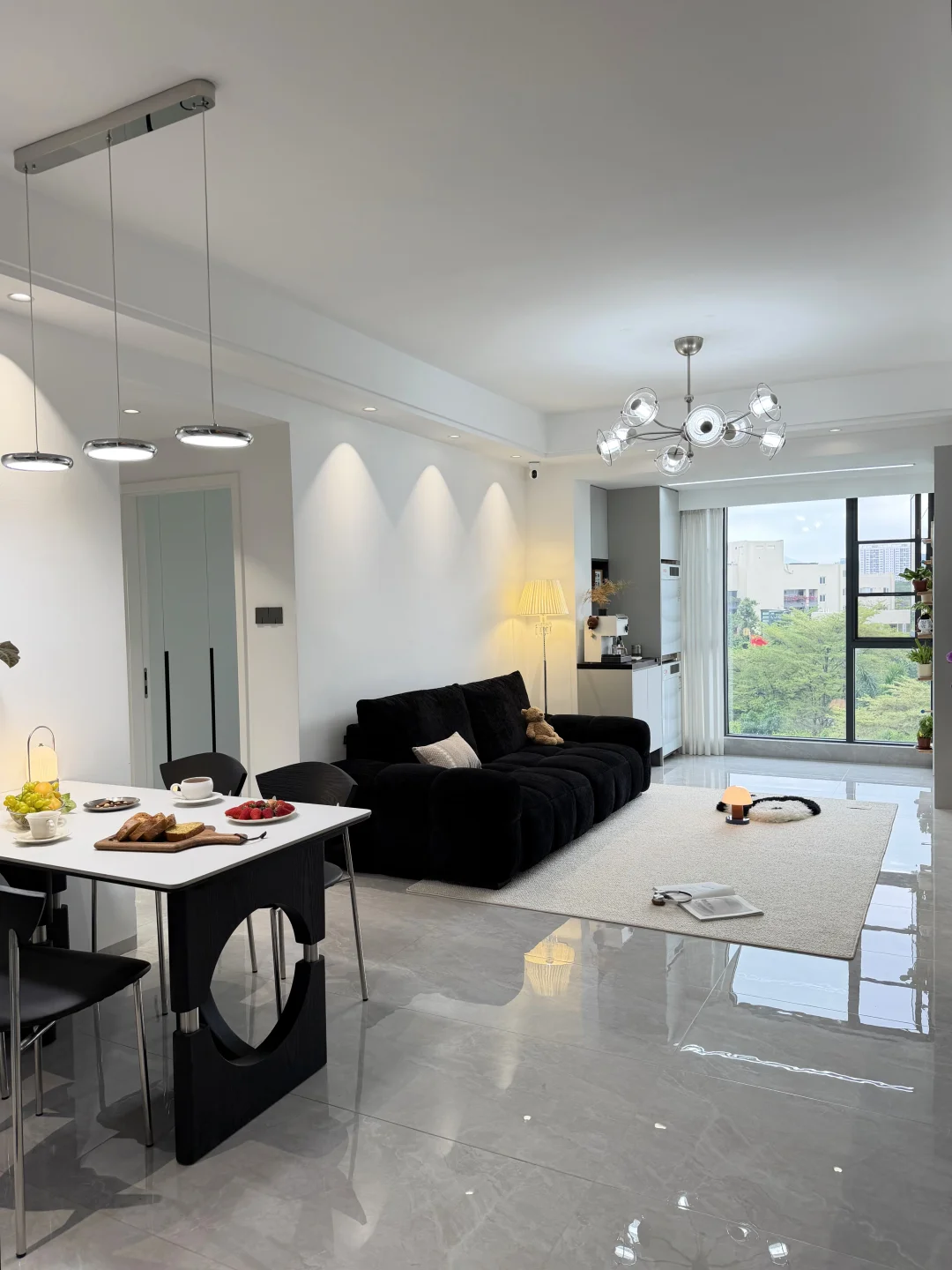 ·地面全屋通铺浅灰色亮面砖,视觉上显大很多,日常打扫也是真的省心