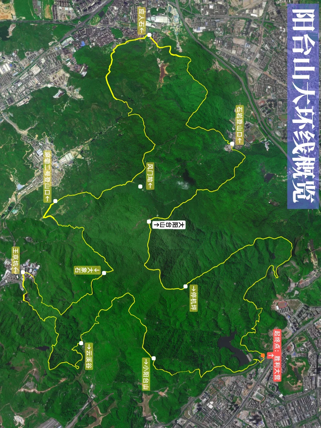 ❷行程:胜利大营救广场→小阳台山→云溪谷→王京坑→大象石→麻磡二号登山口→应人石社区→石岩登山口→大阳台山→胜利大营救广场