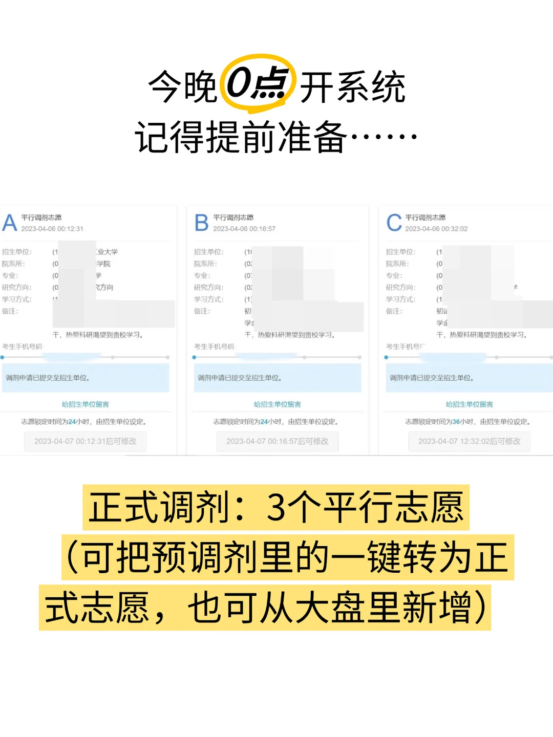 关键信息:重点记录各院校的调剂系统开放时长、志愿锁定时间(优先选择锁定时间短的)、复试形式等。